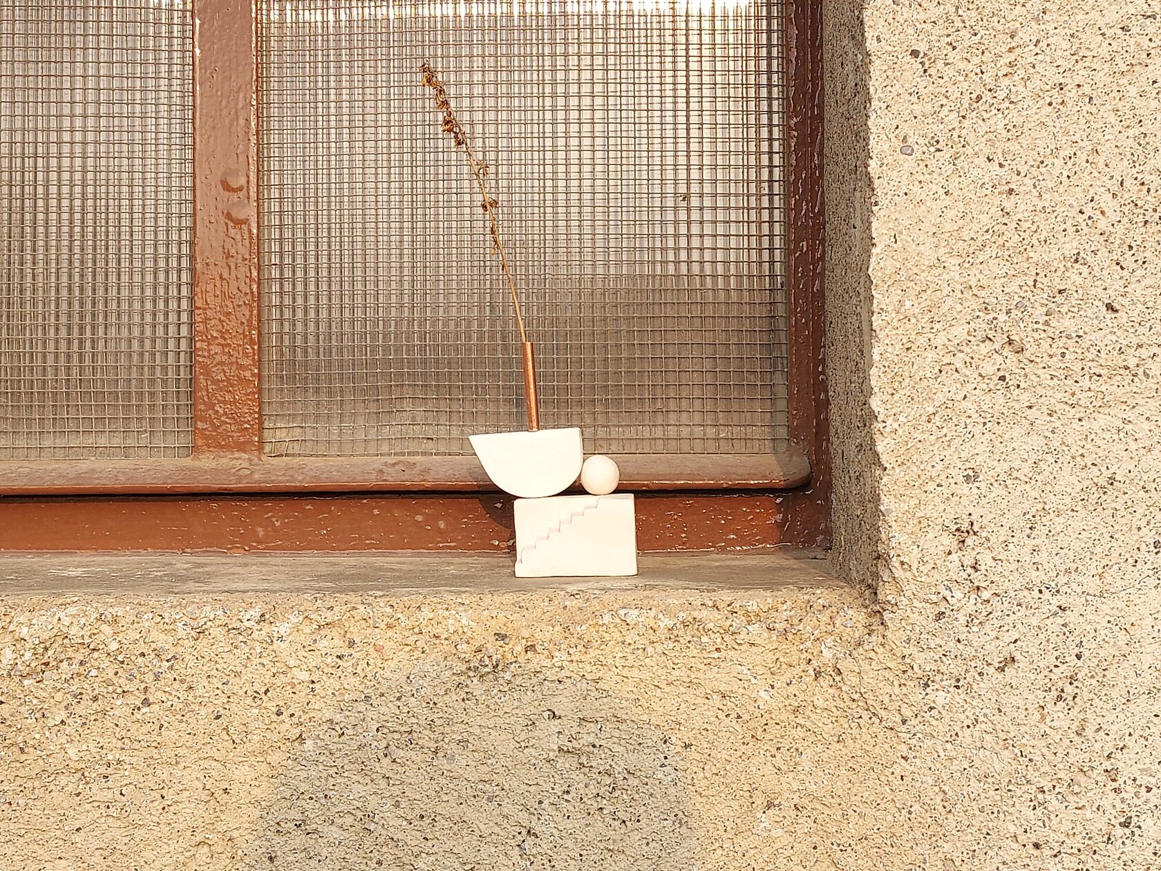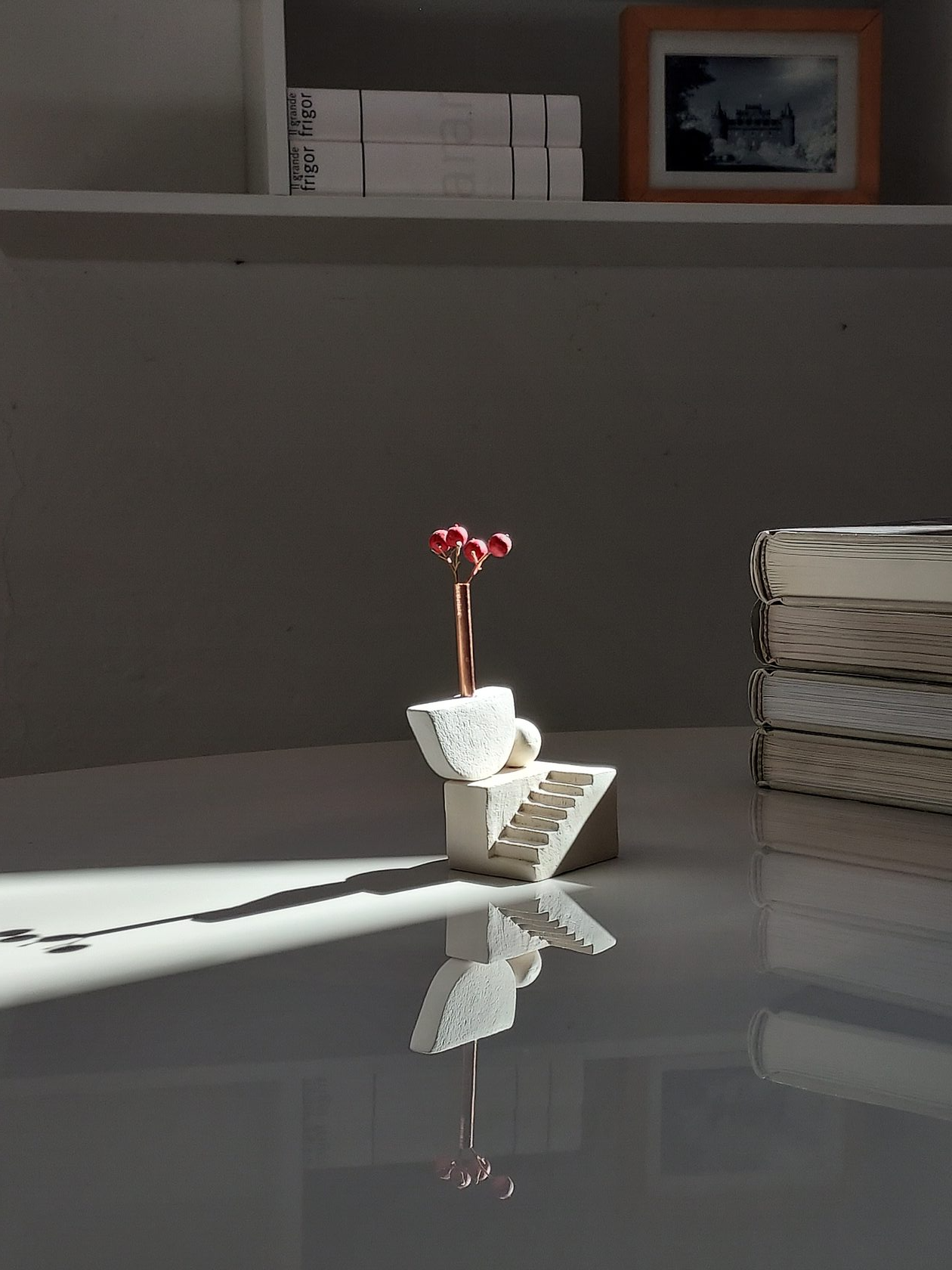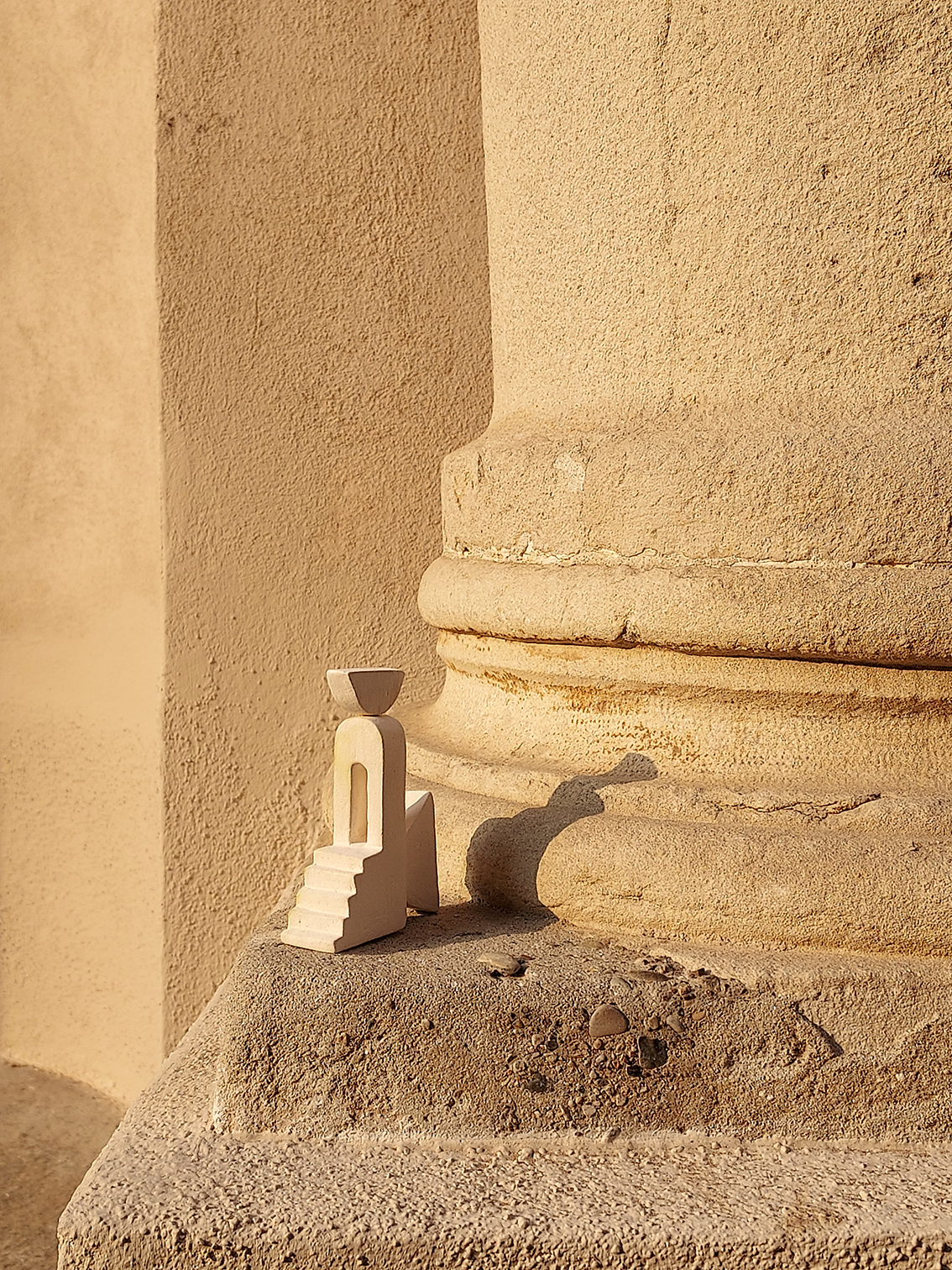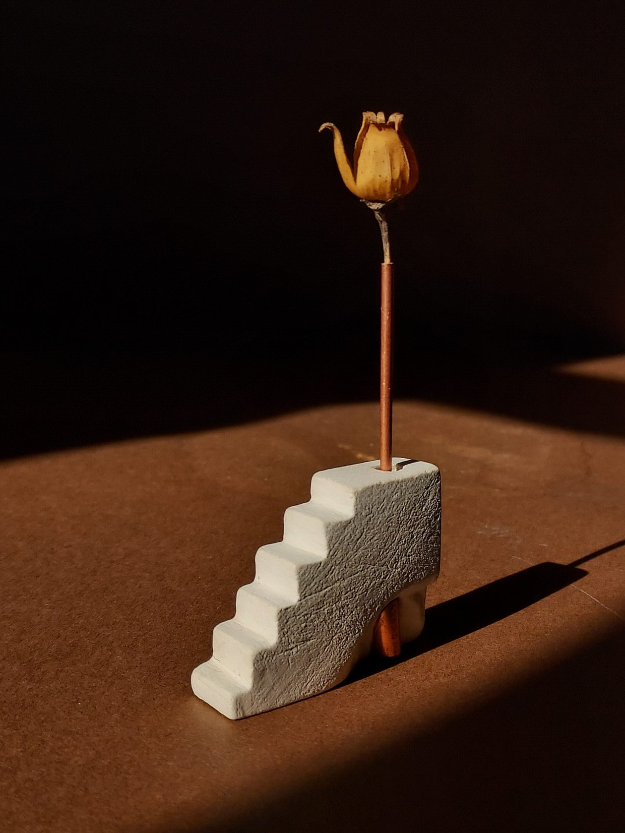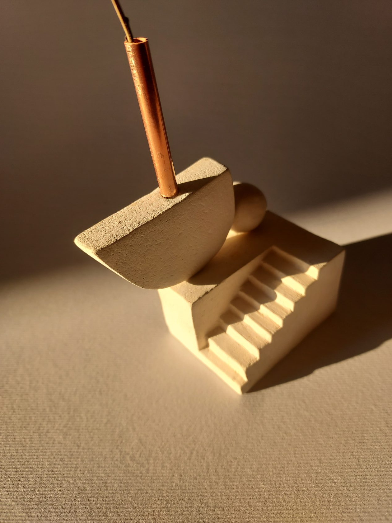 The staircase with a semicircle and a sphere at the top; the sculpture is completed with the brass tube to insert a candle or a dried flower.