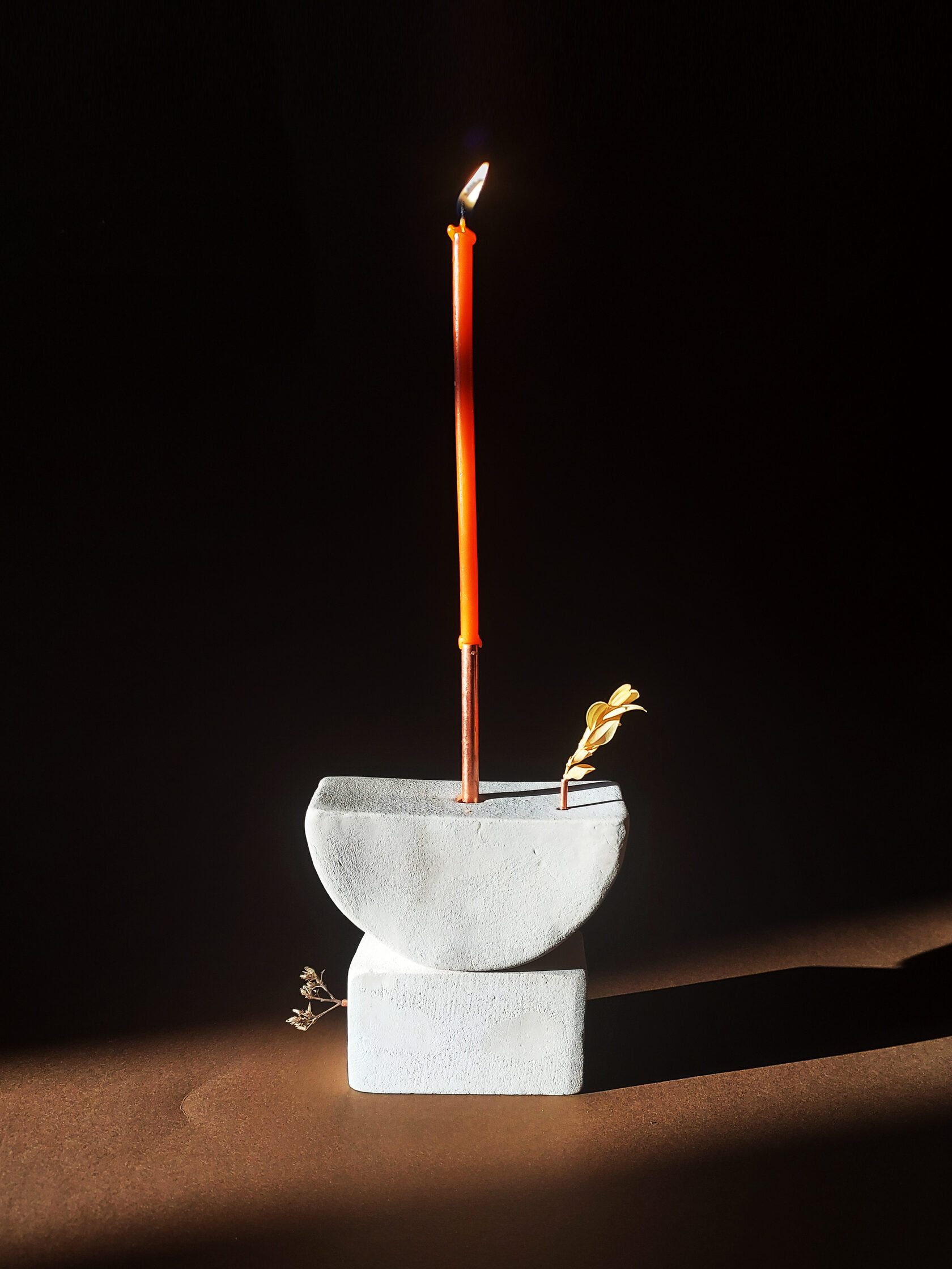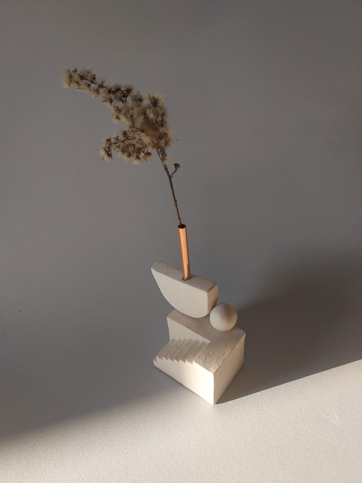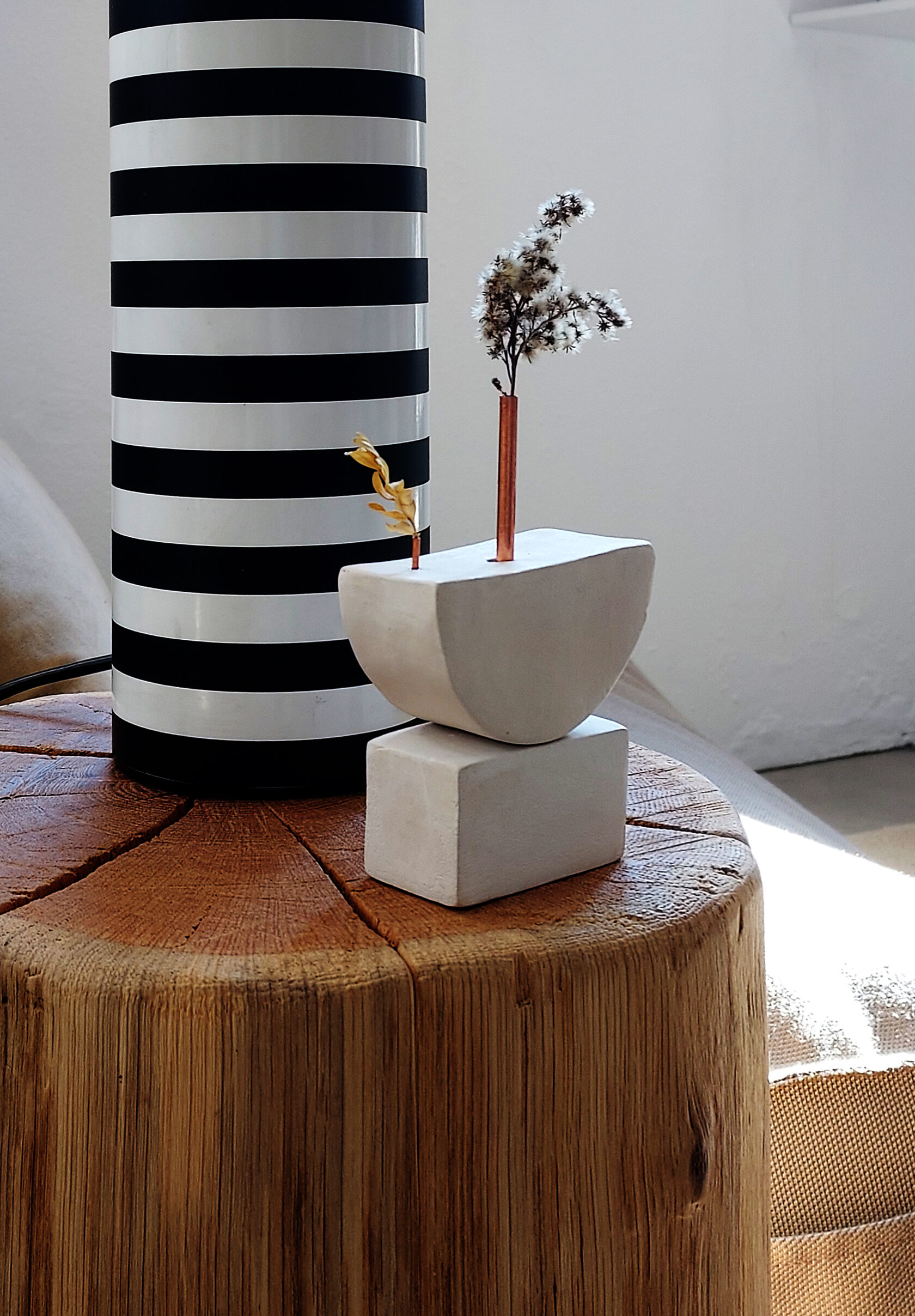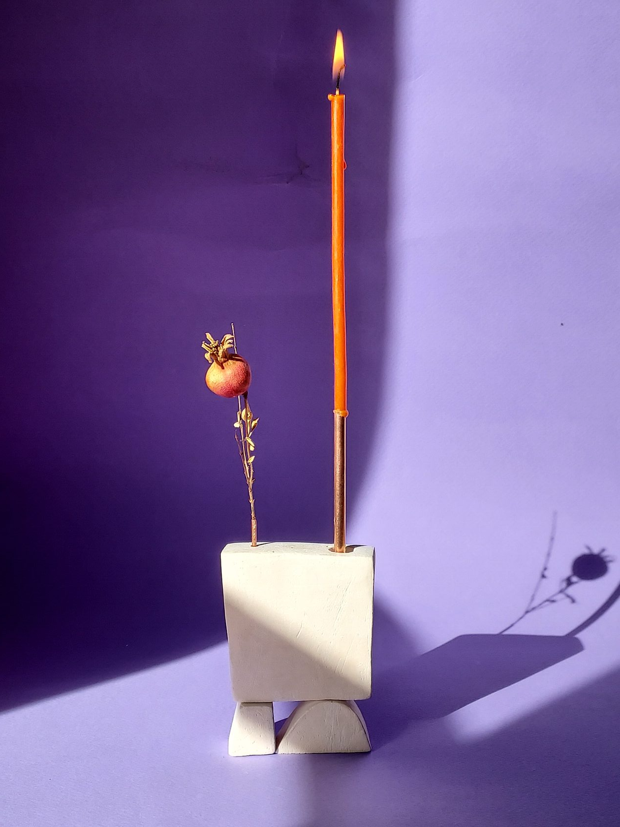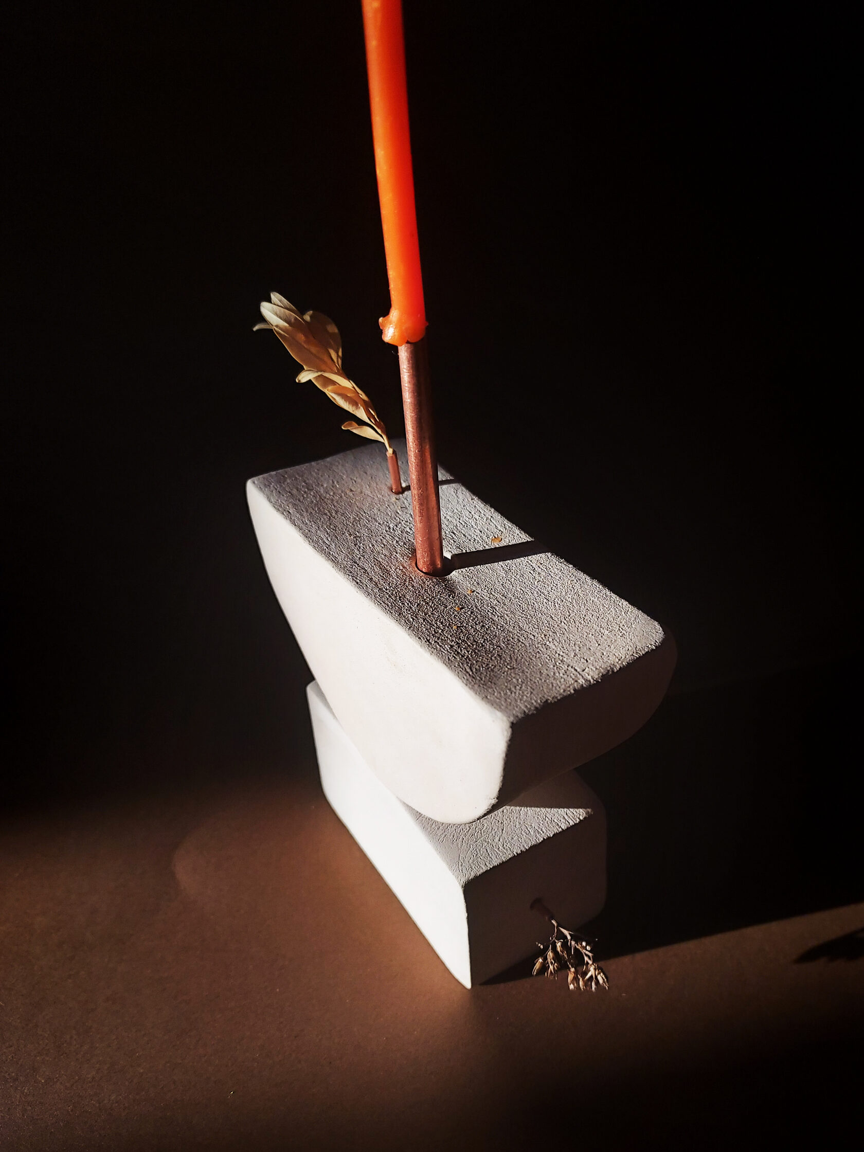 The sculpture is made of two shapes, balancing one on another, and completed with a brass tube for a candle or a dried flower.