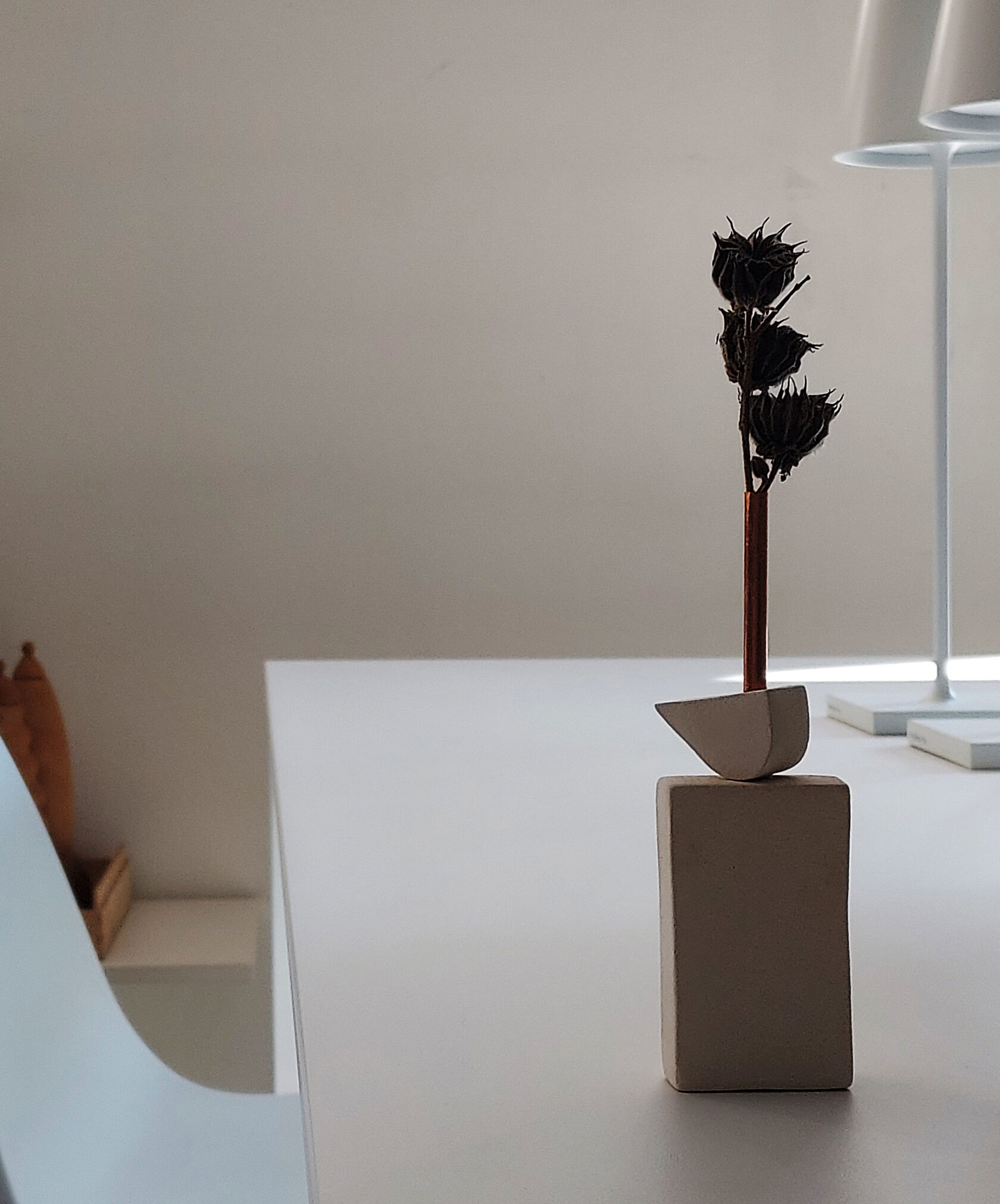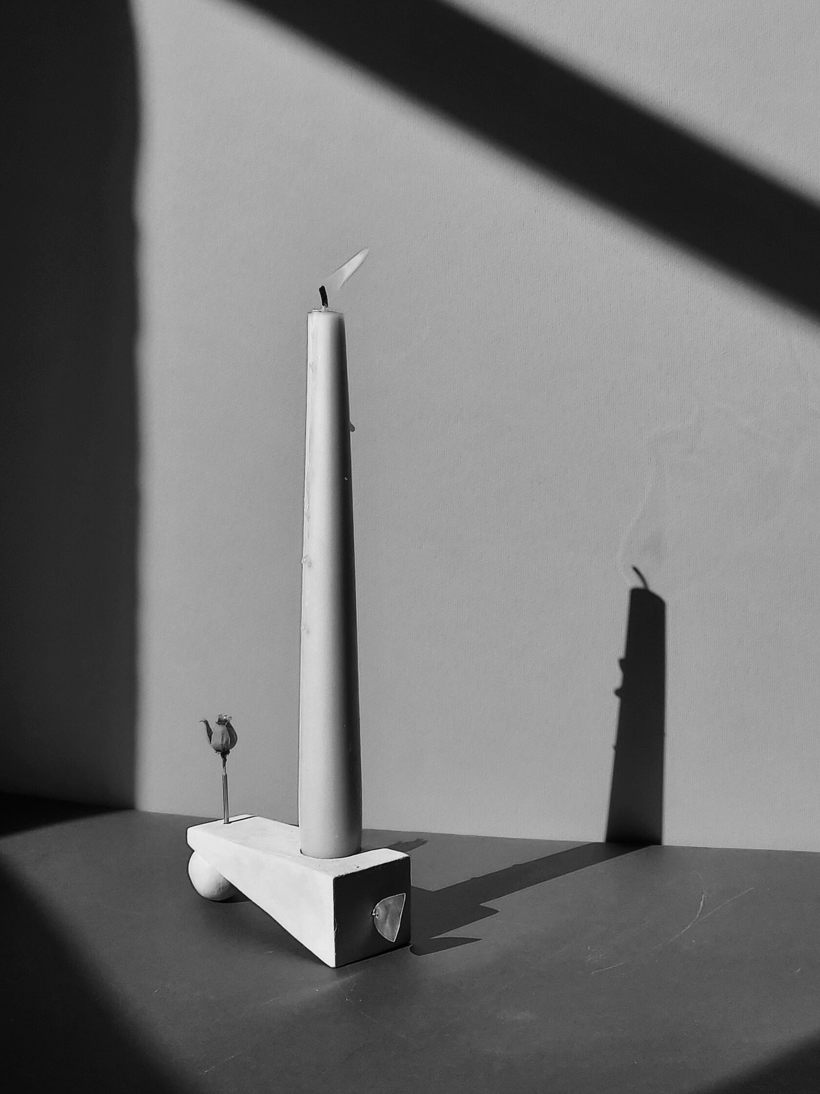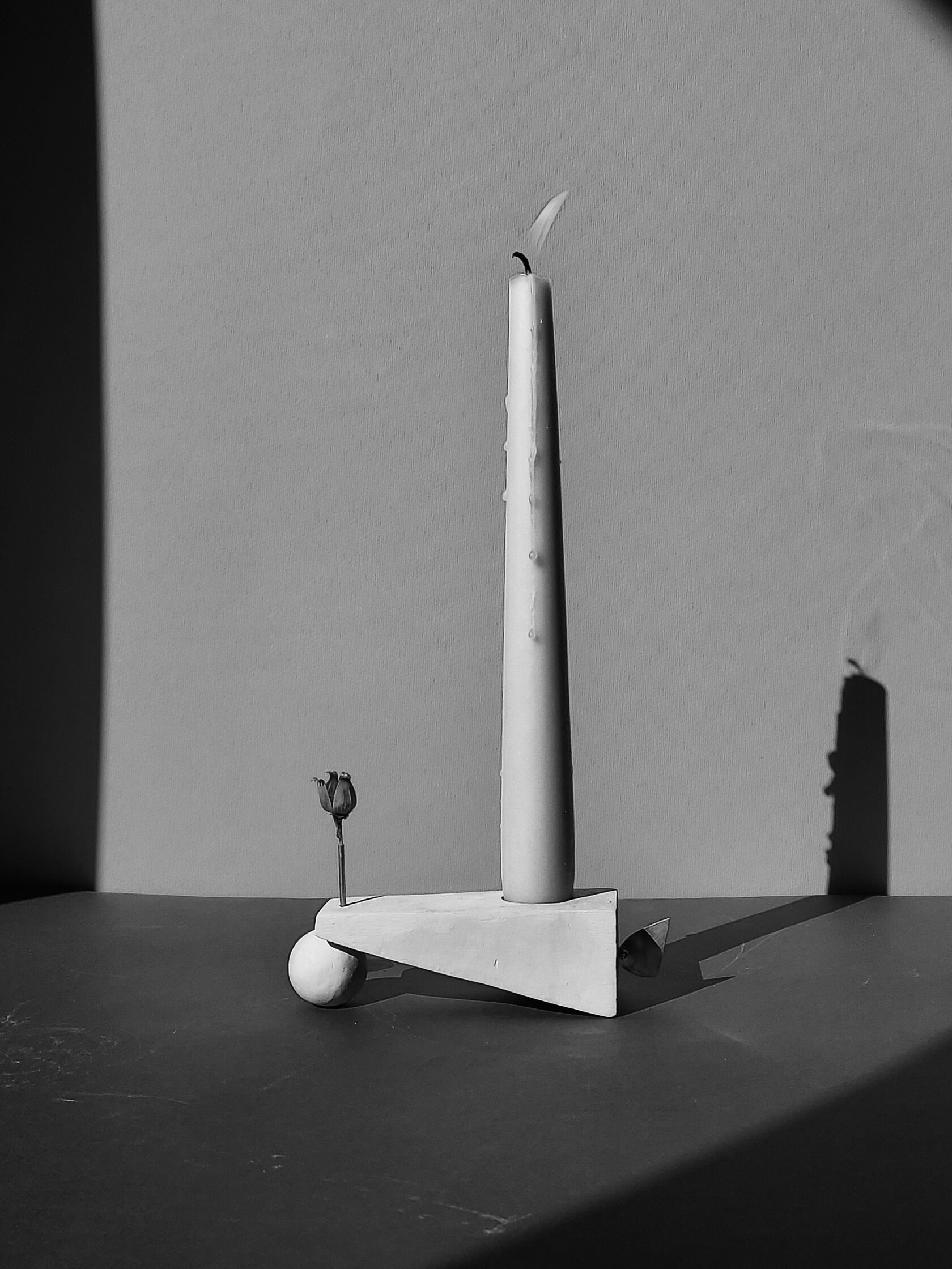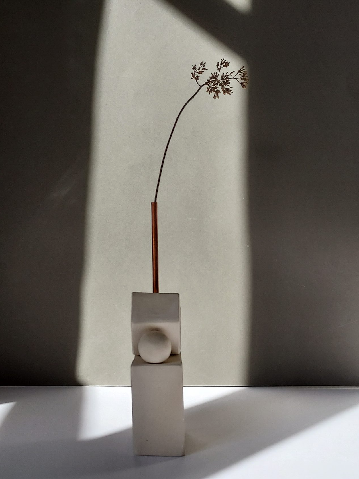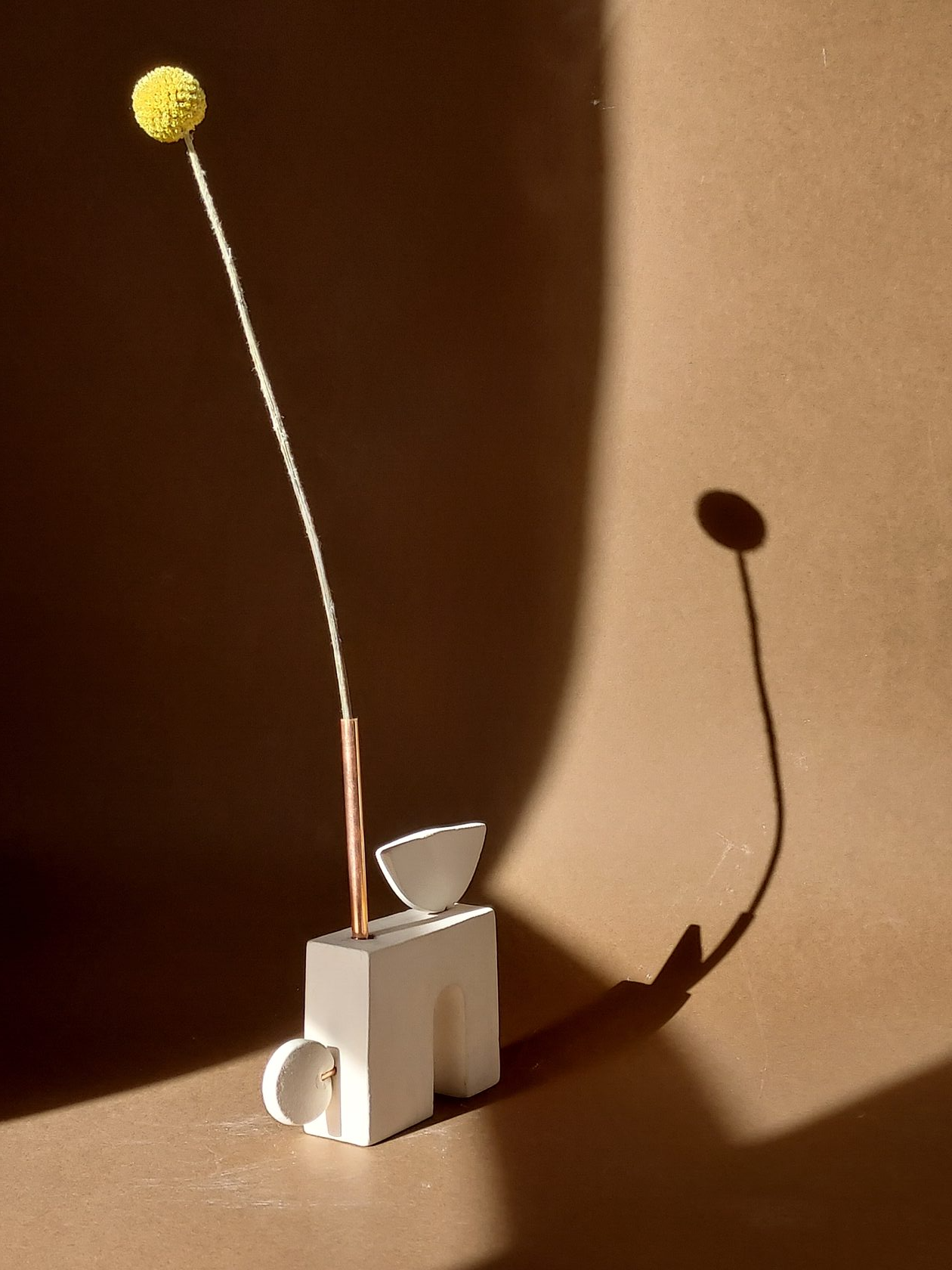 The sculpture is made of two shapes, balancing one on another, and completed with a brass tube for a candle or a dried flower.