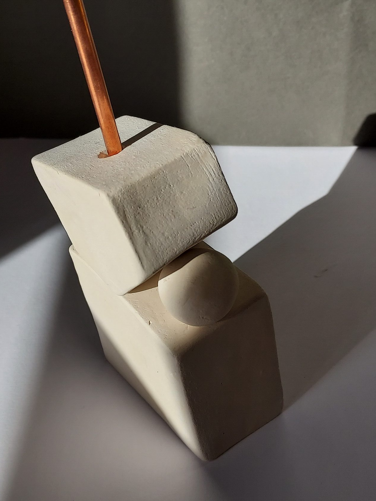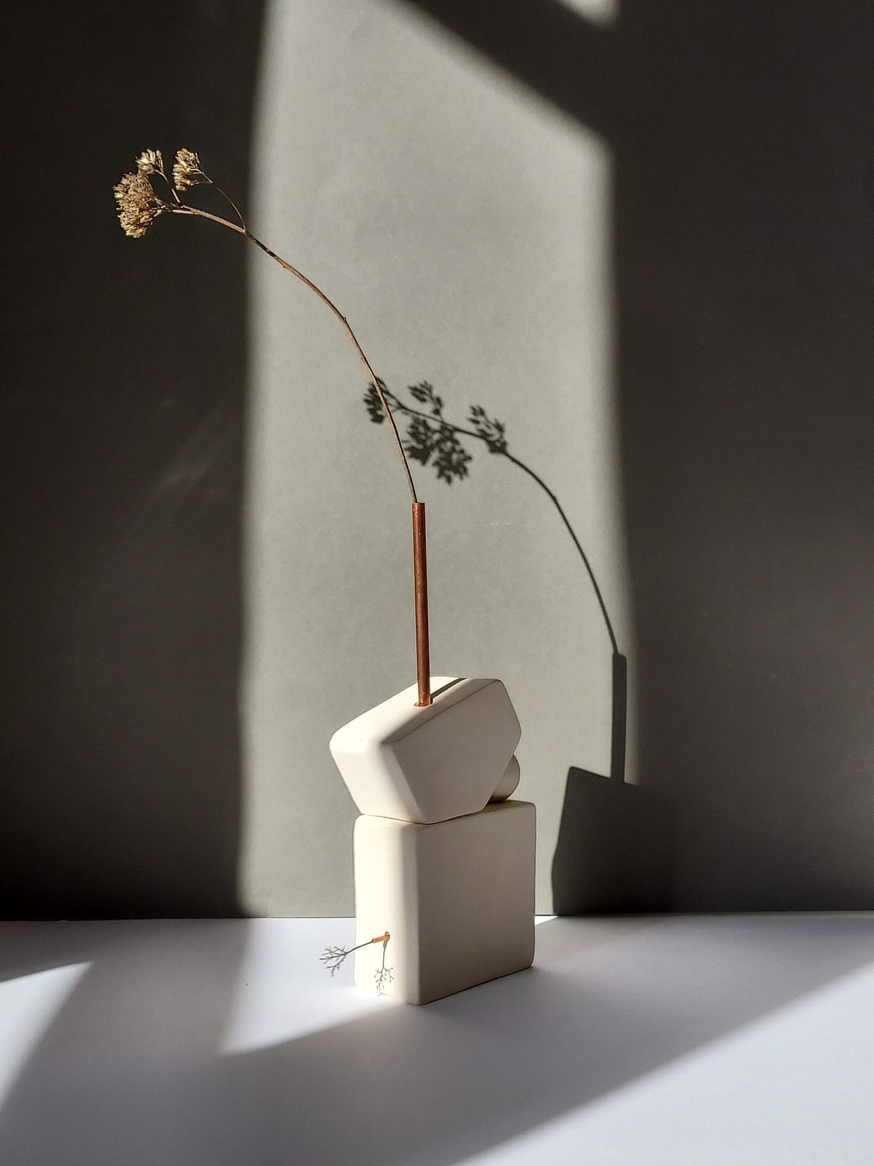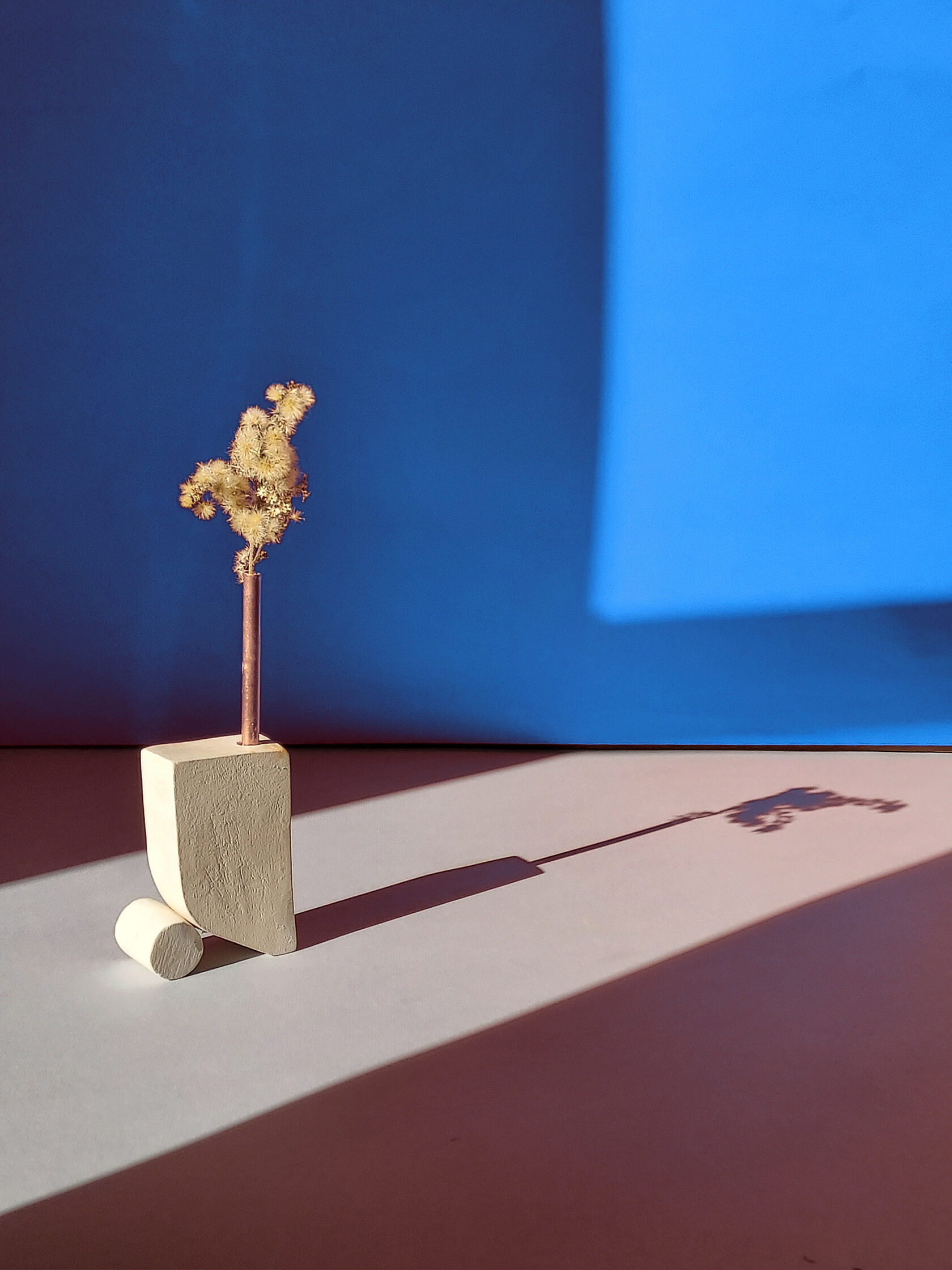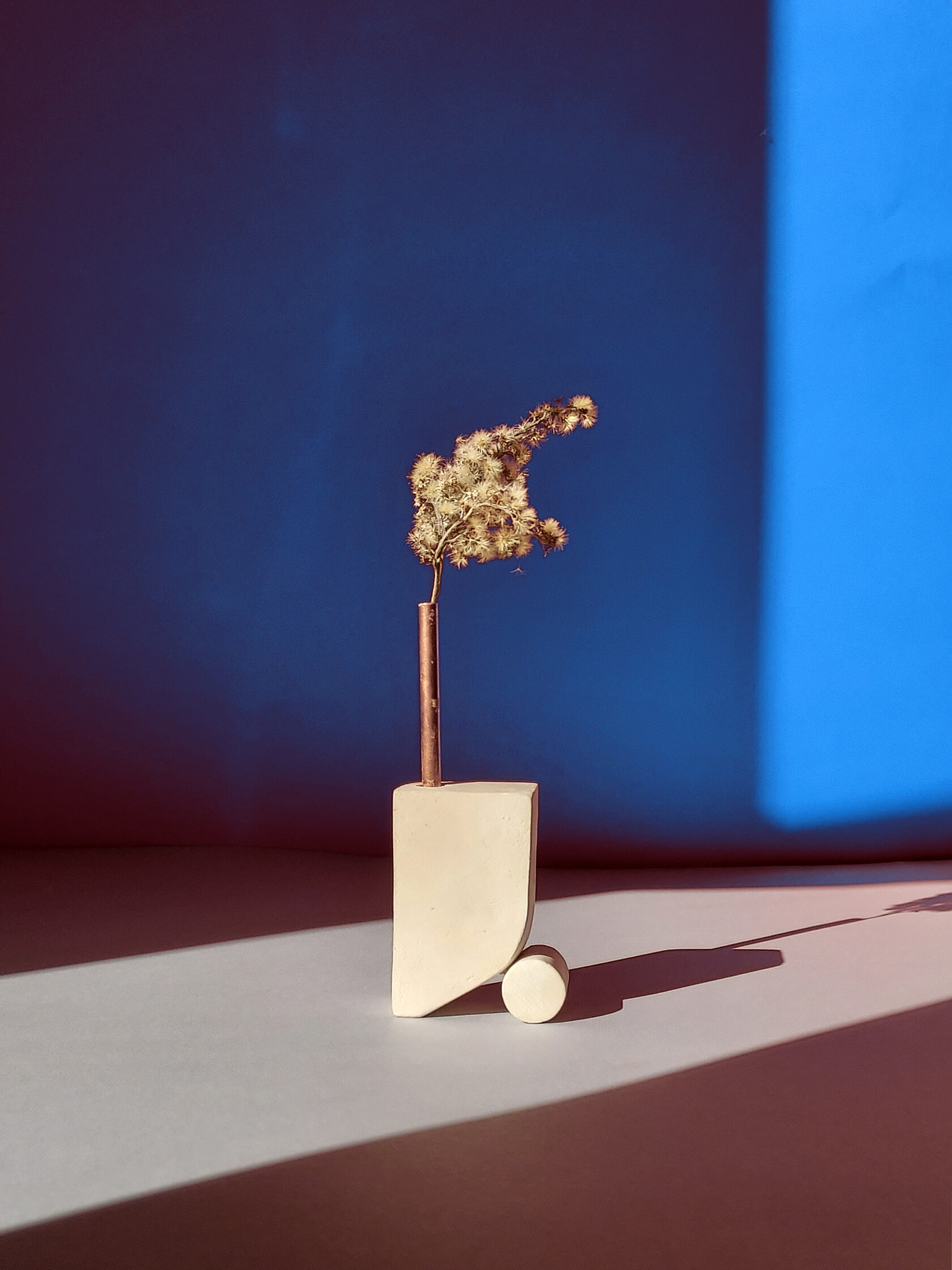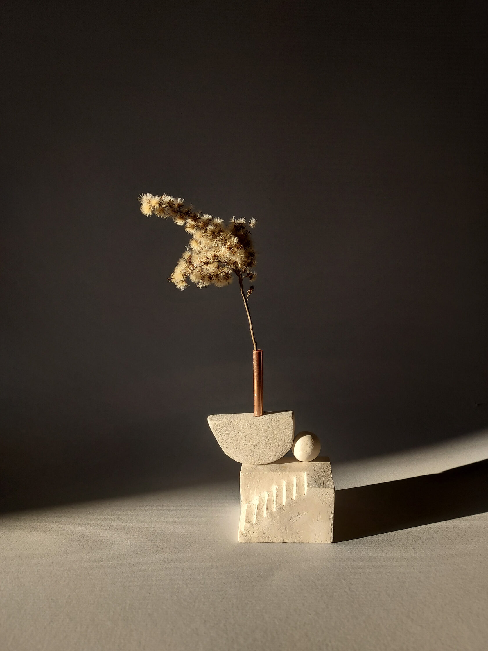 The sculpture is made of two shapes, balancing one on another, and completed with a brass tube for a candle or a dried flower.