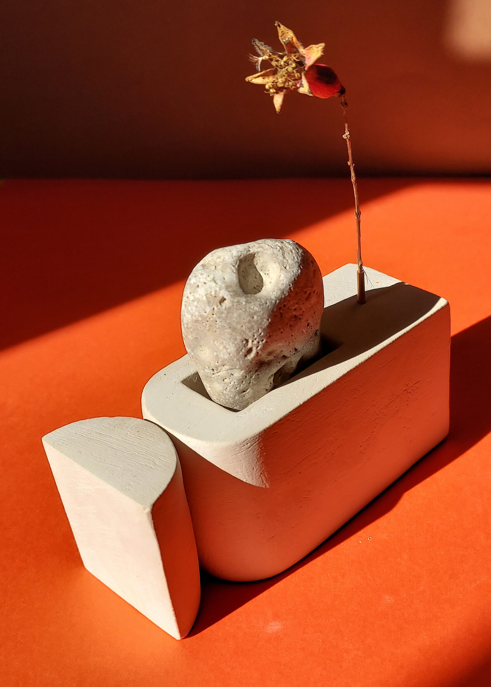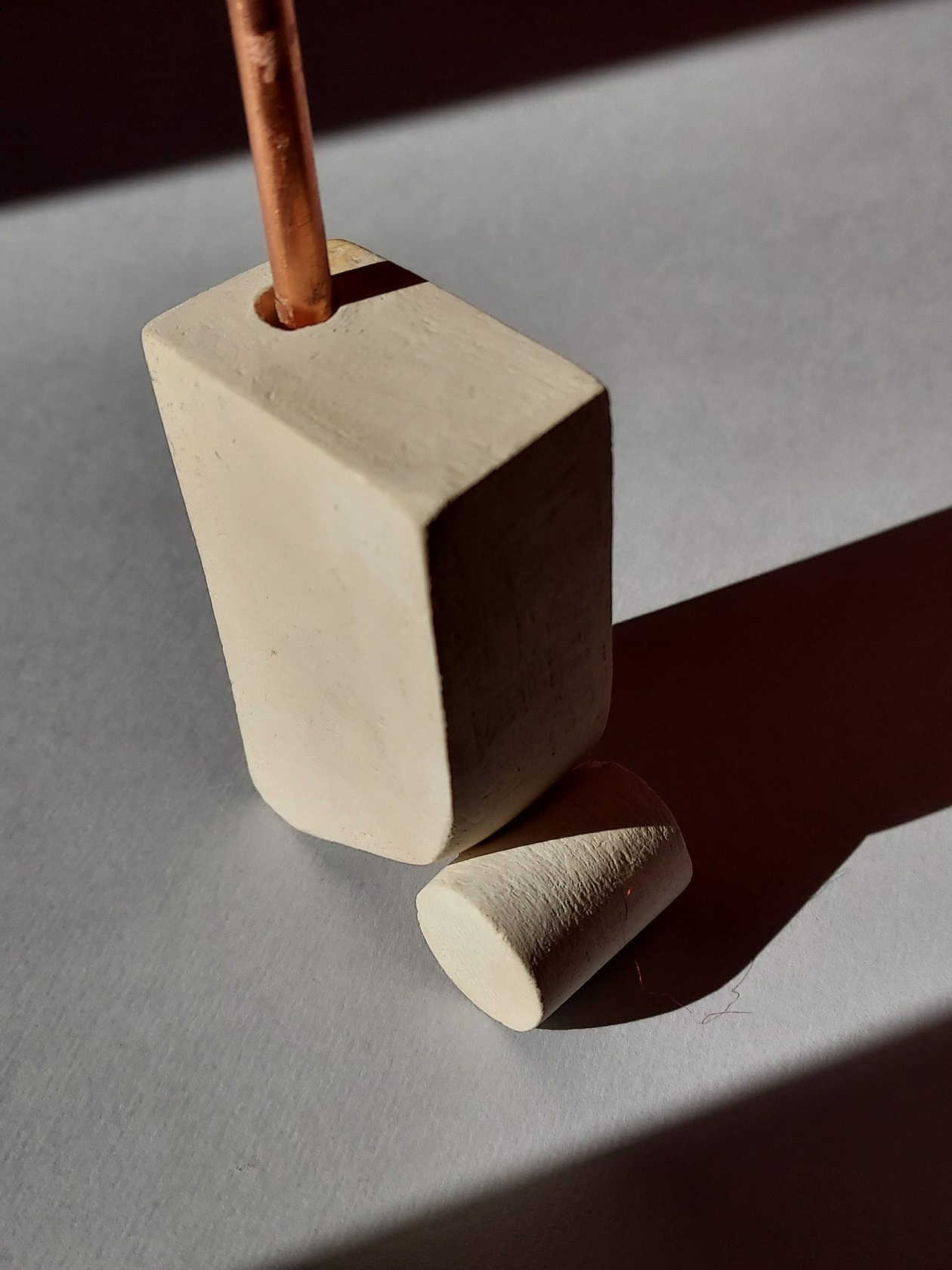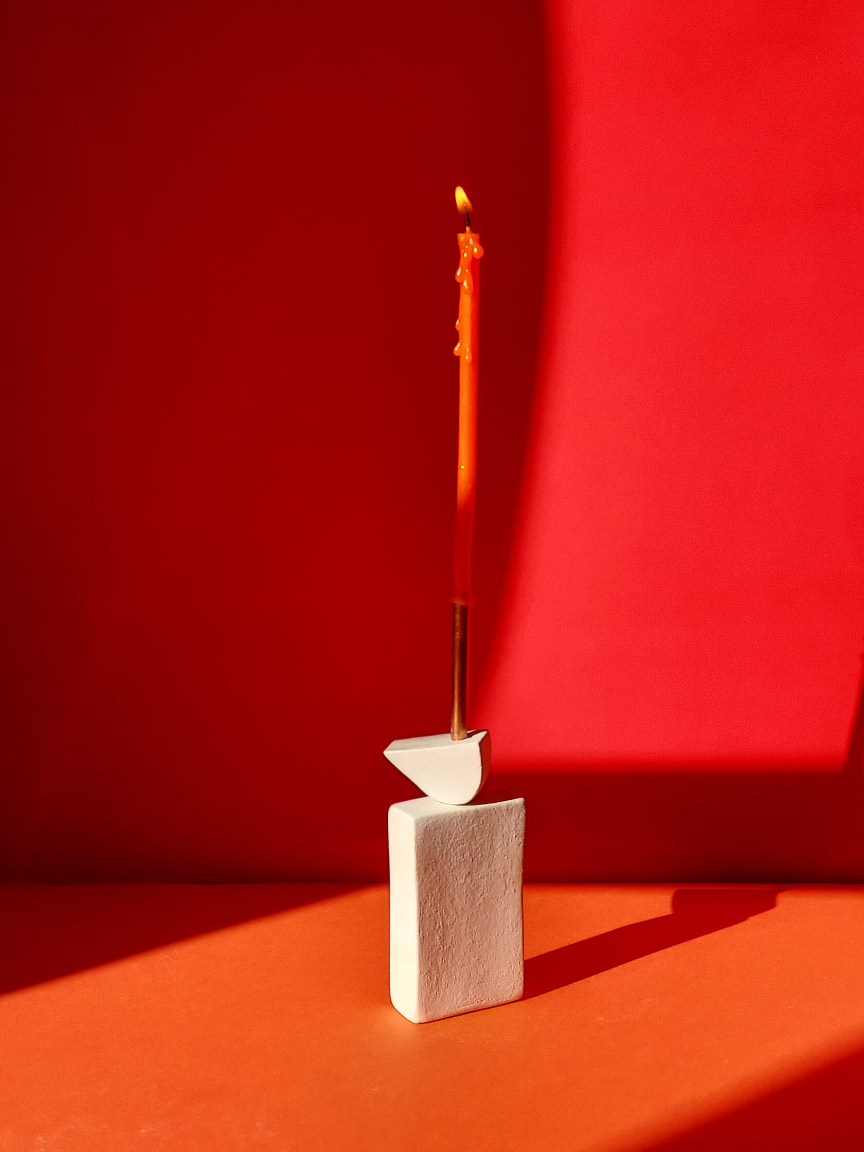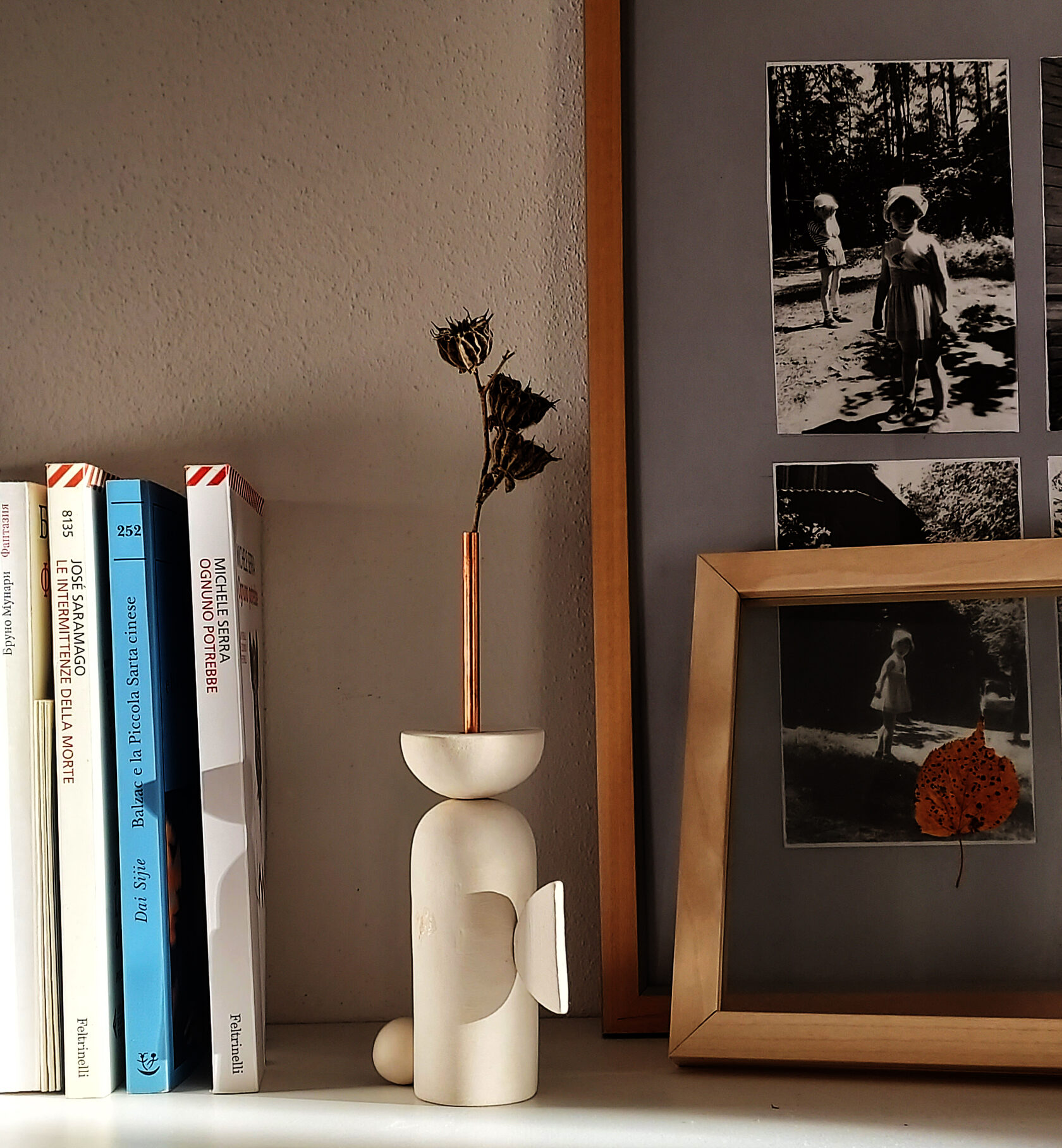 The sculpture is made of two shapes, balancing one on another, and completed with a brass tube for a candle or a dried flower.