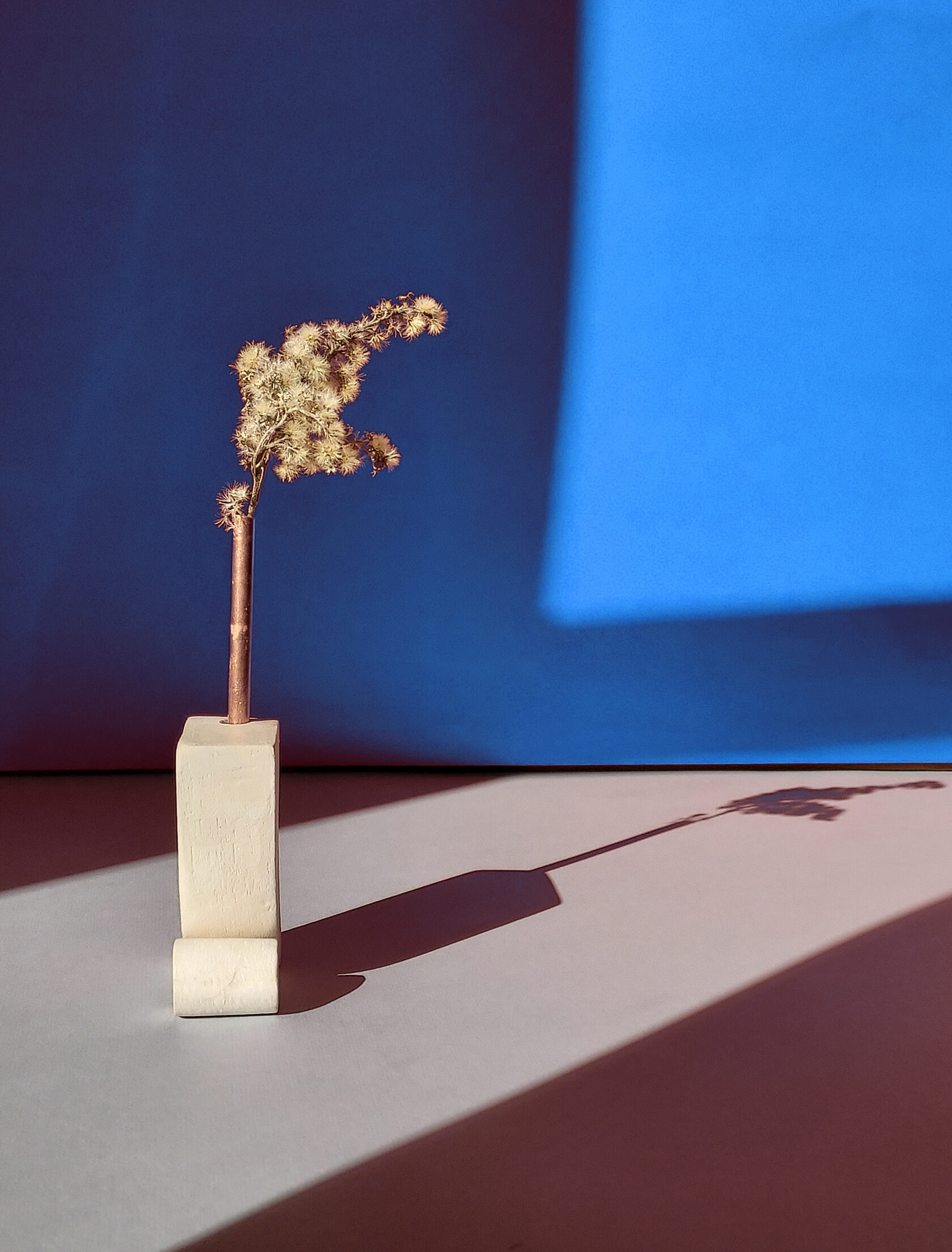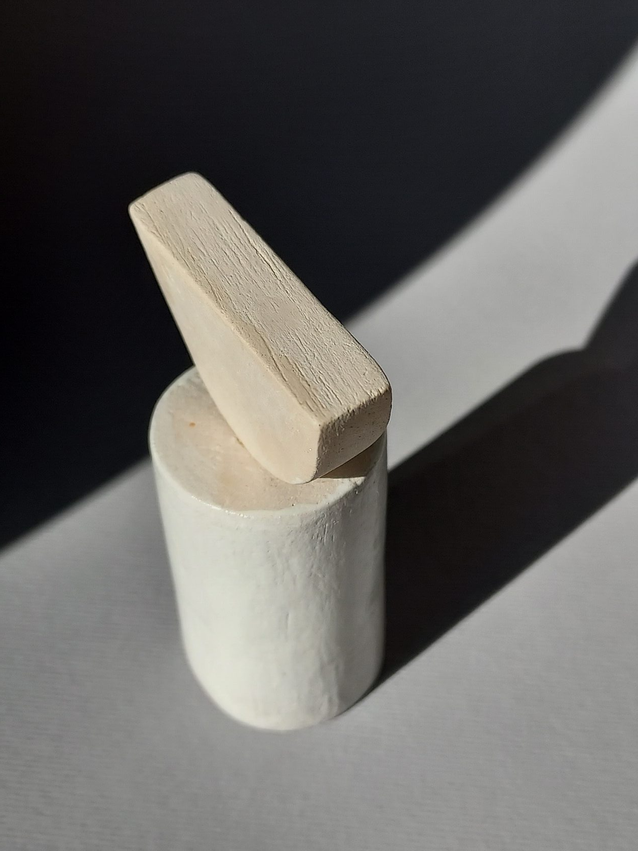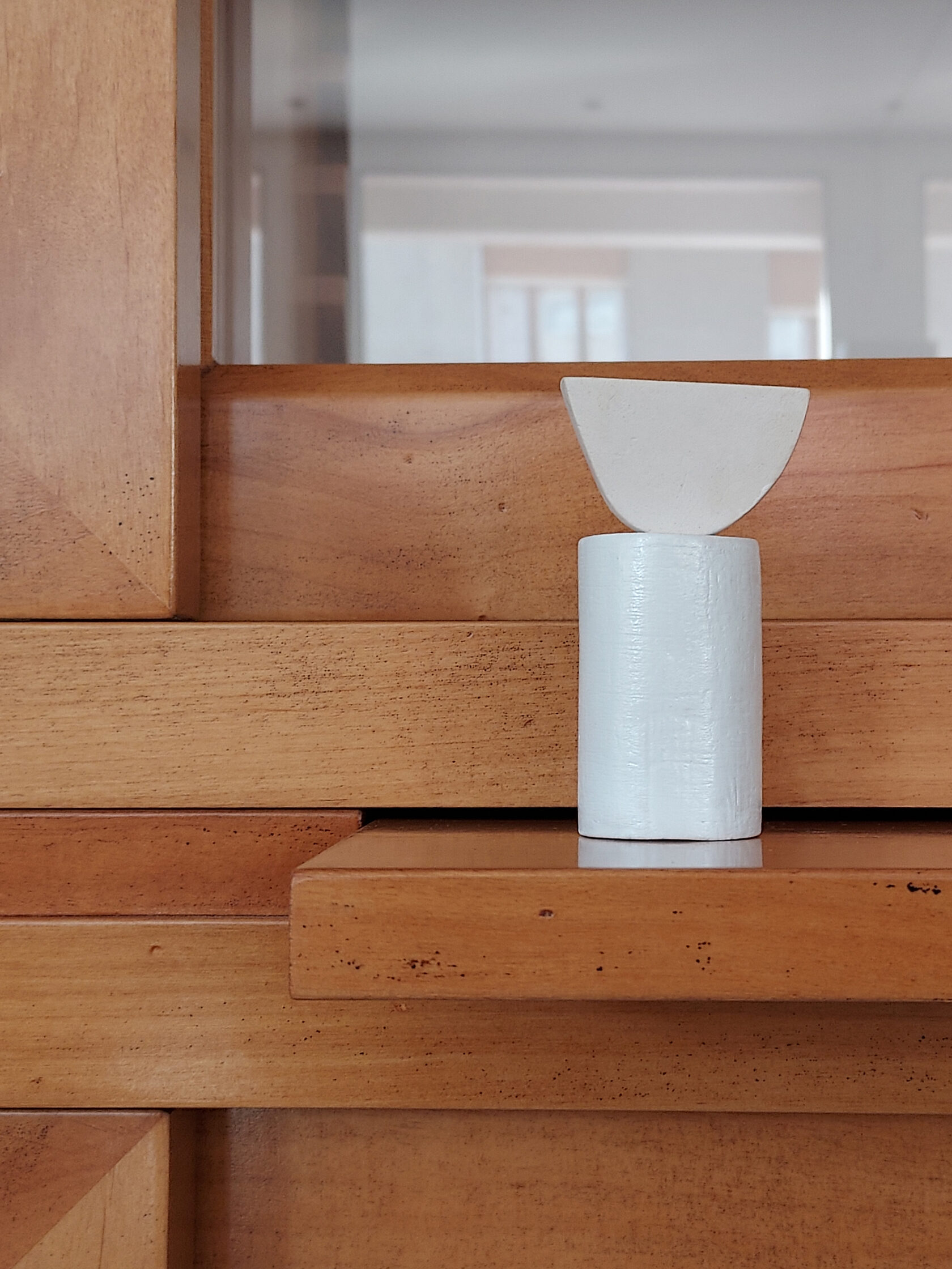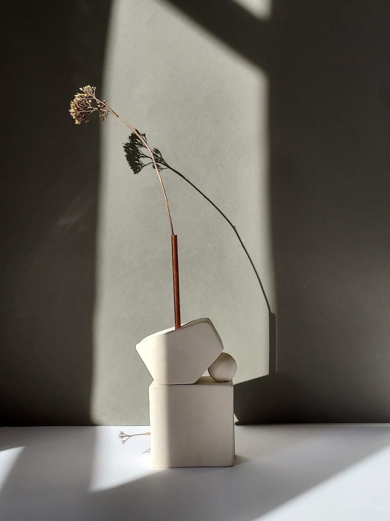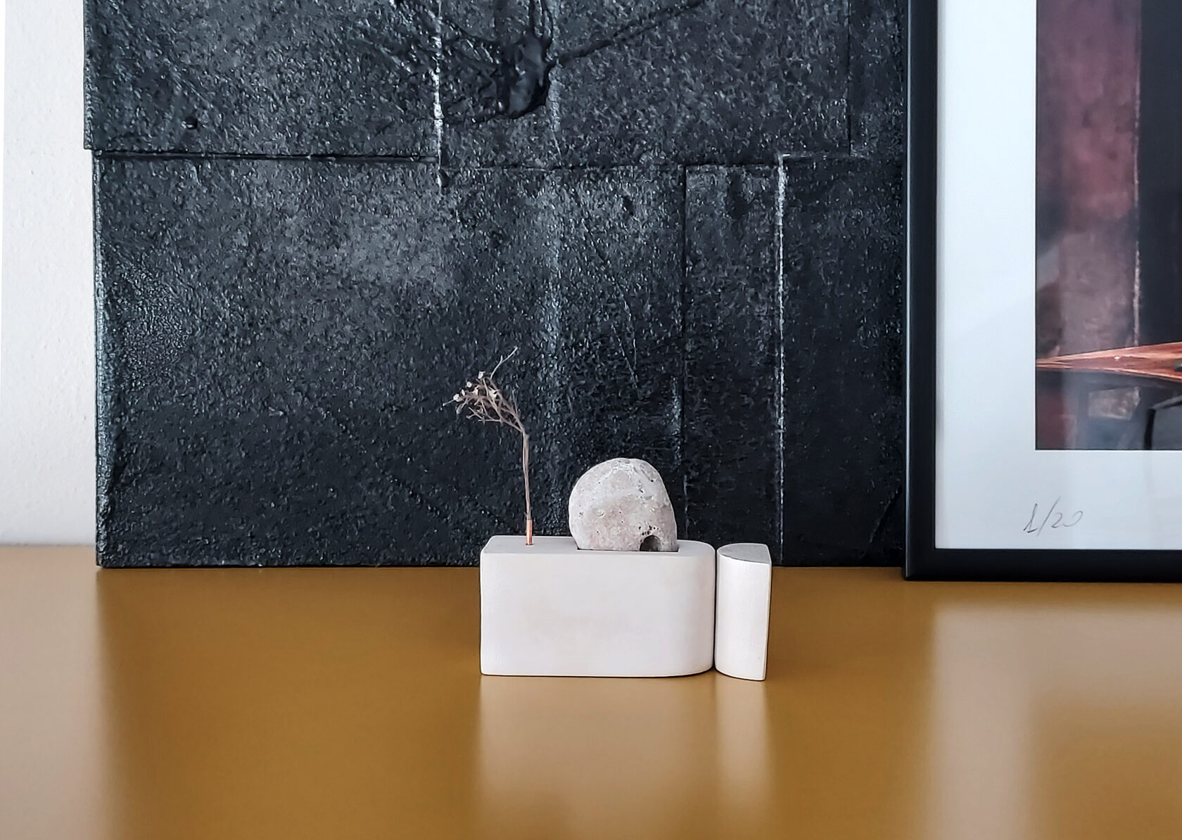 The sculpture is made of two shapes, balancing one on another, and completed with a brass tube for a candle or a dried flower.
