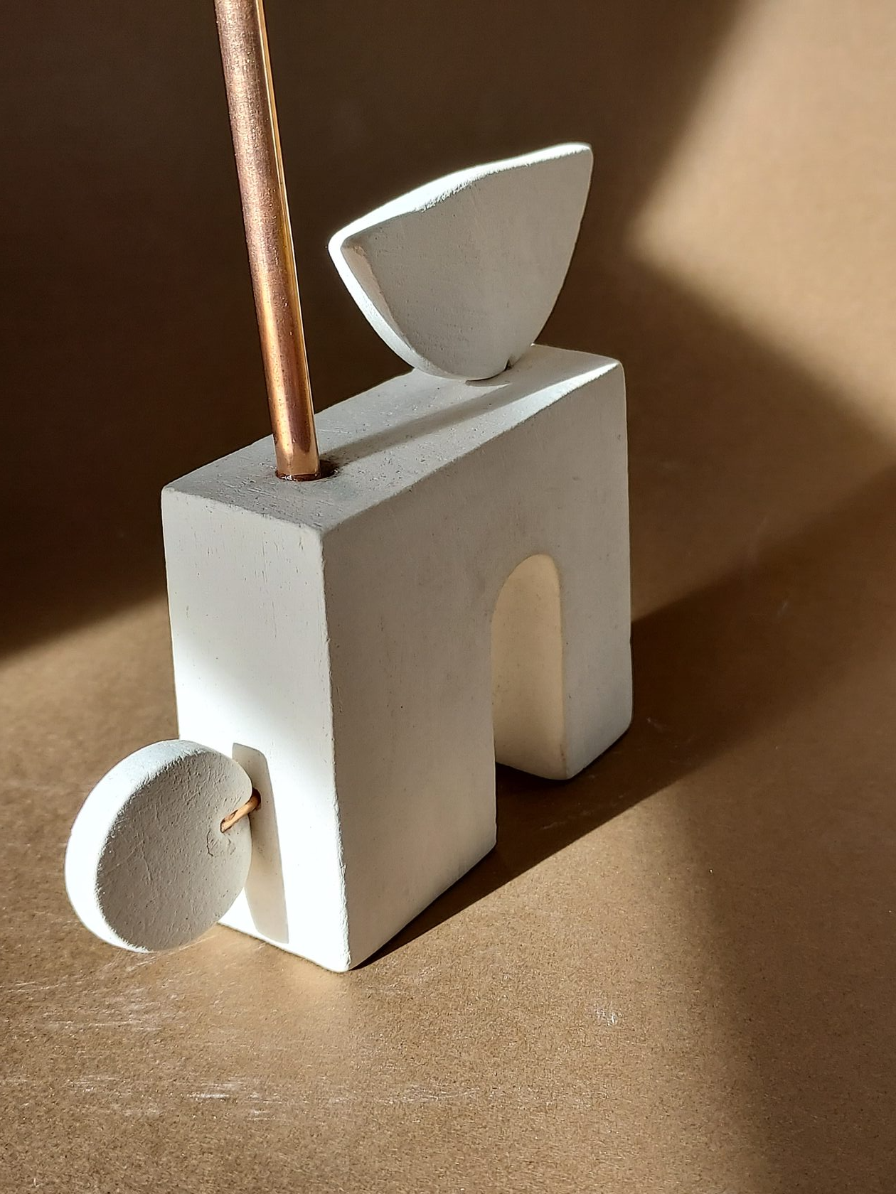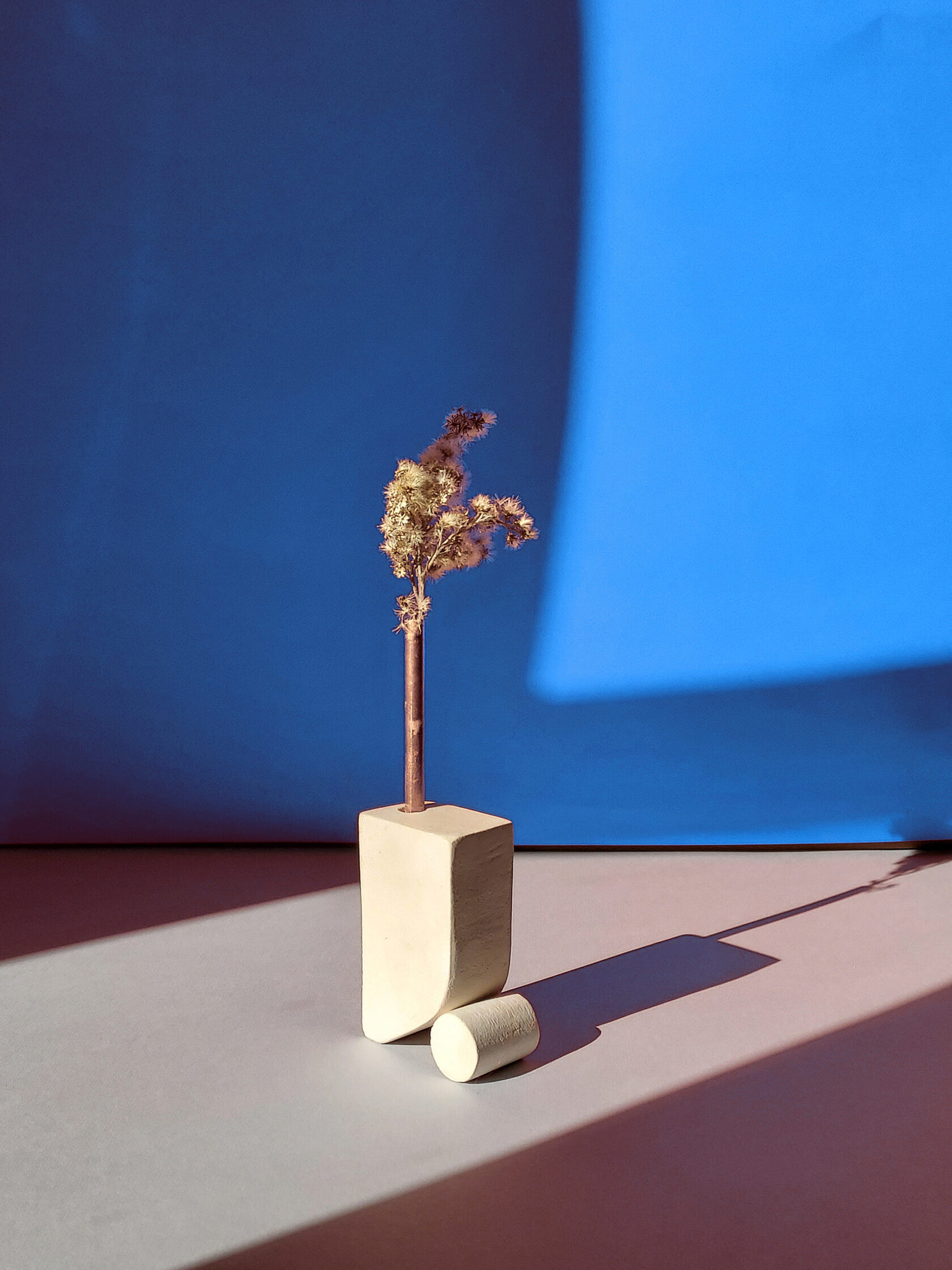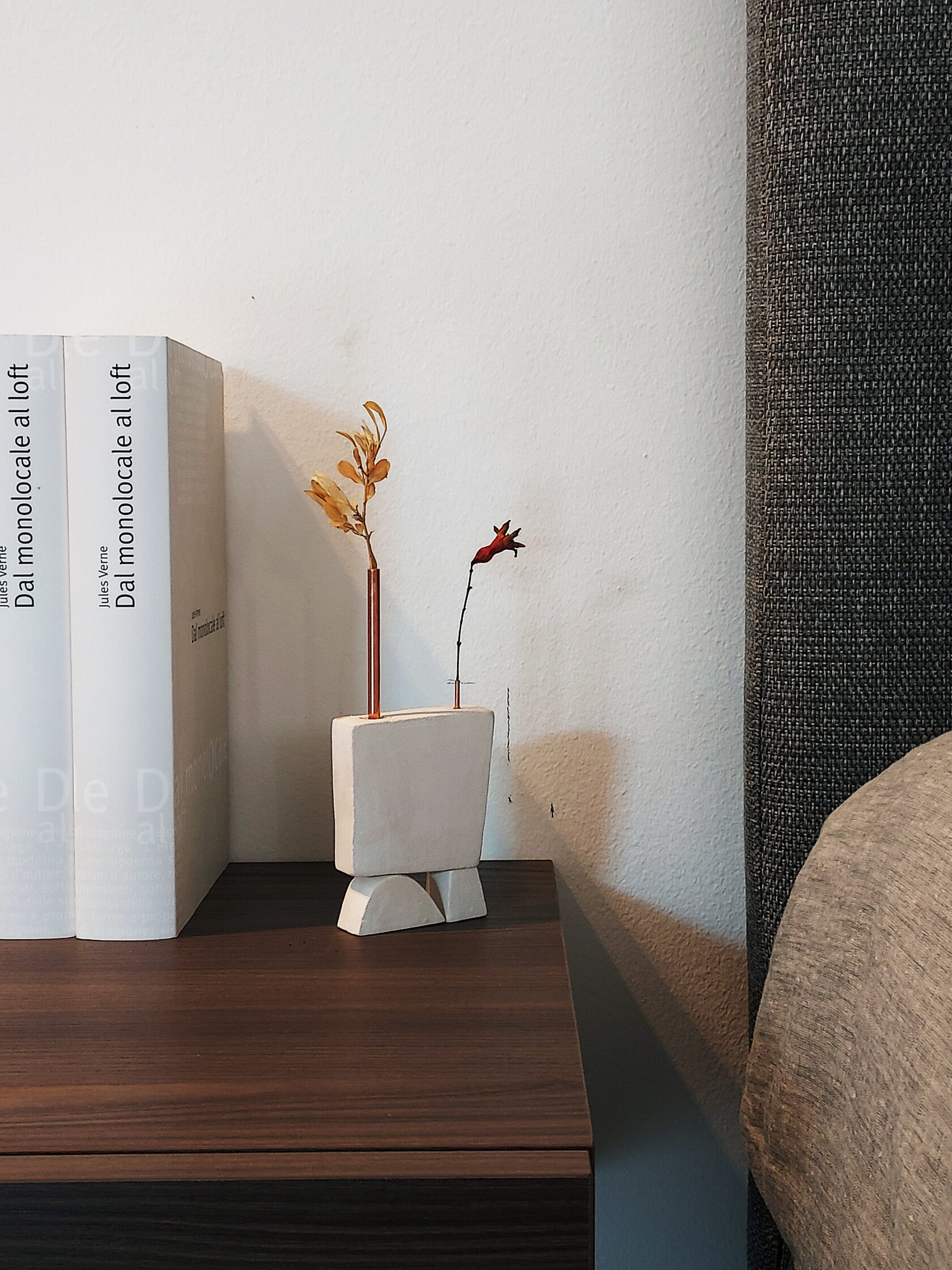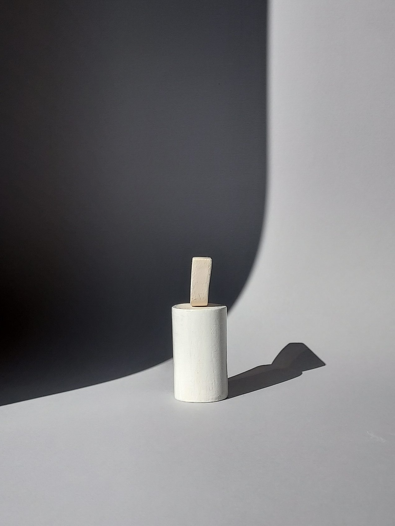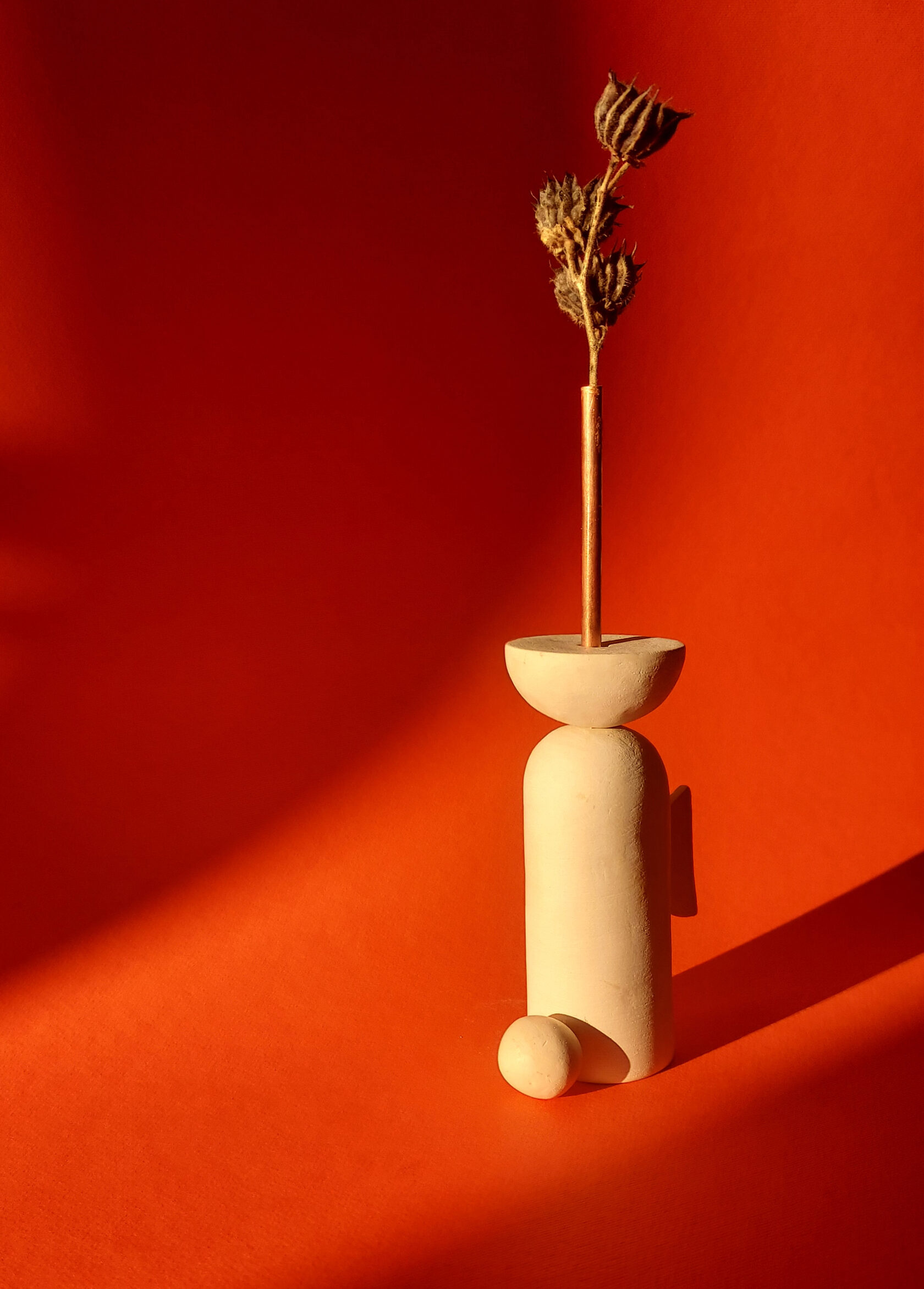 The sculpture is made of two shapes, balancing one on another, and completed with a brass tube for a candle or a dried flower.
