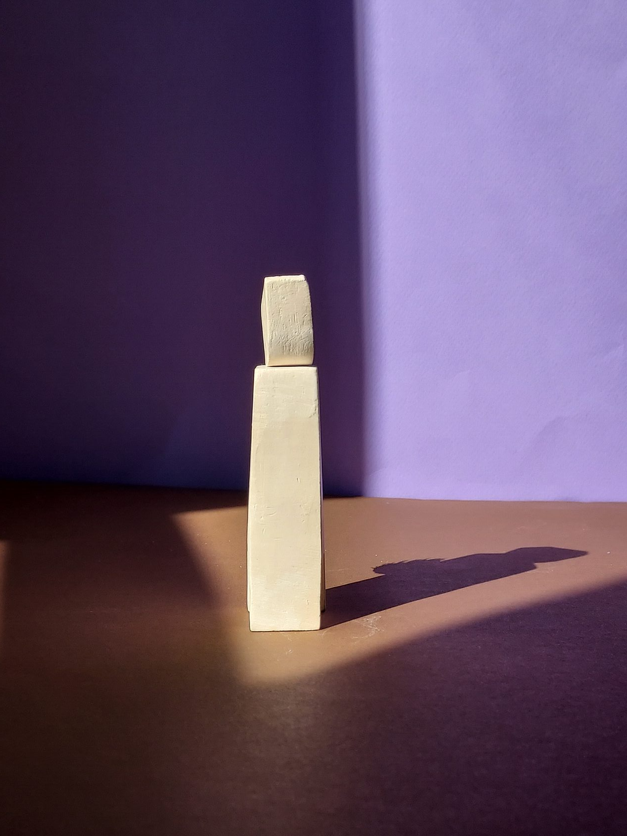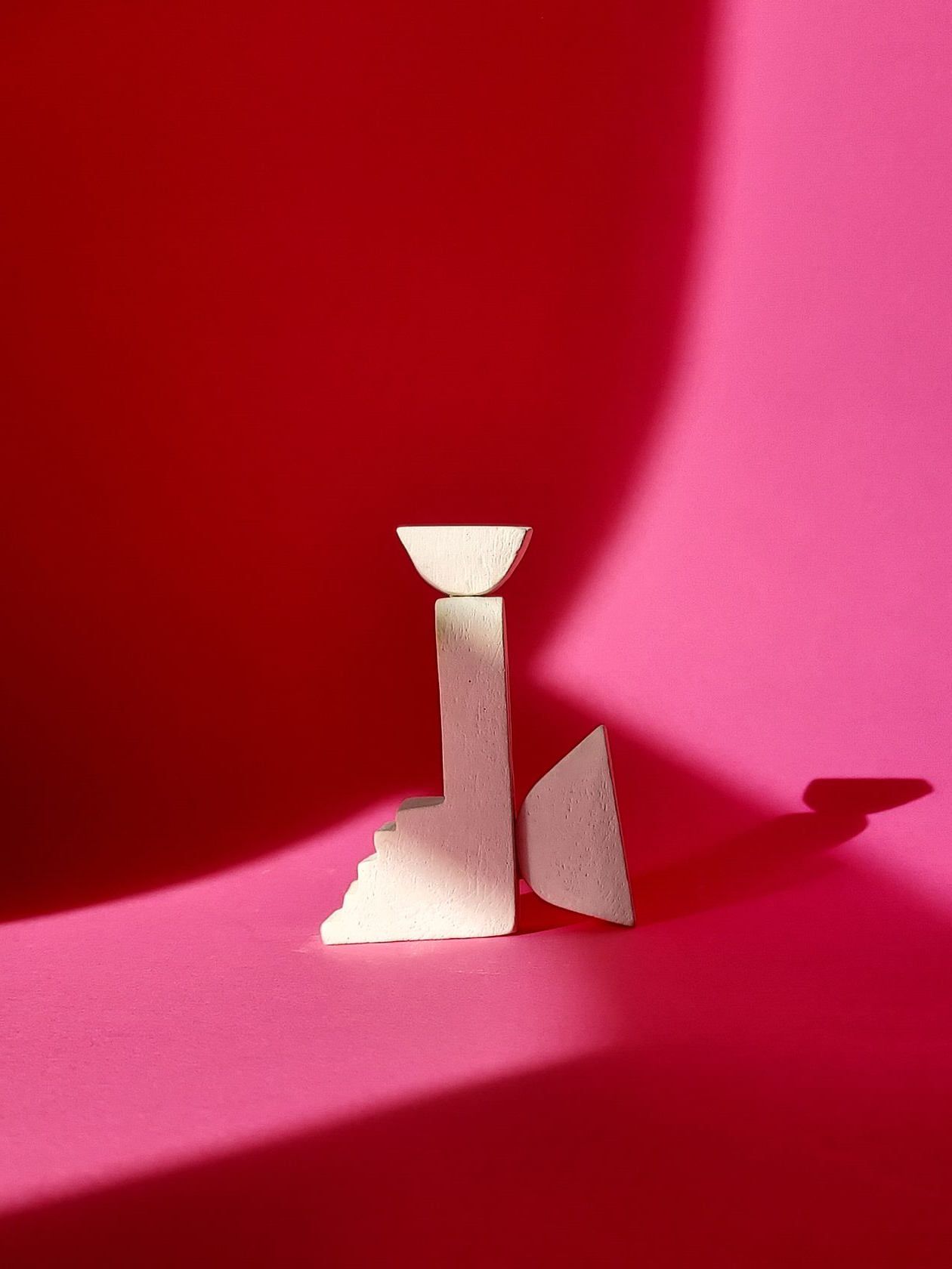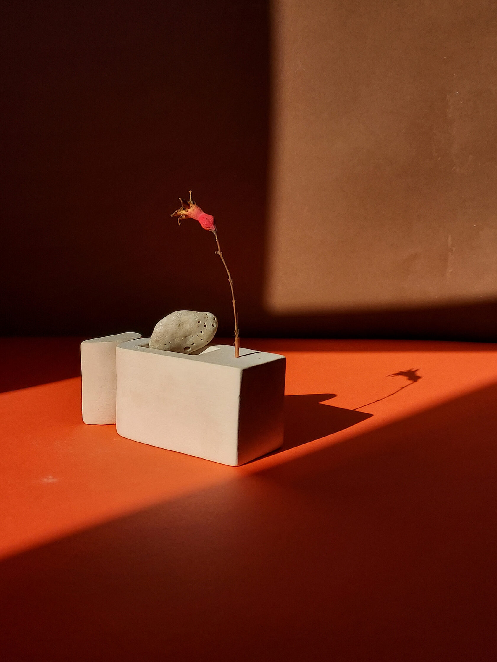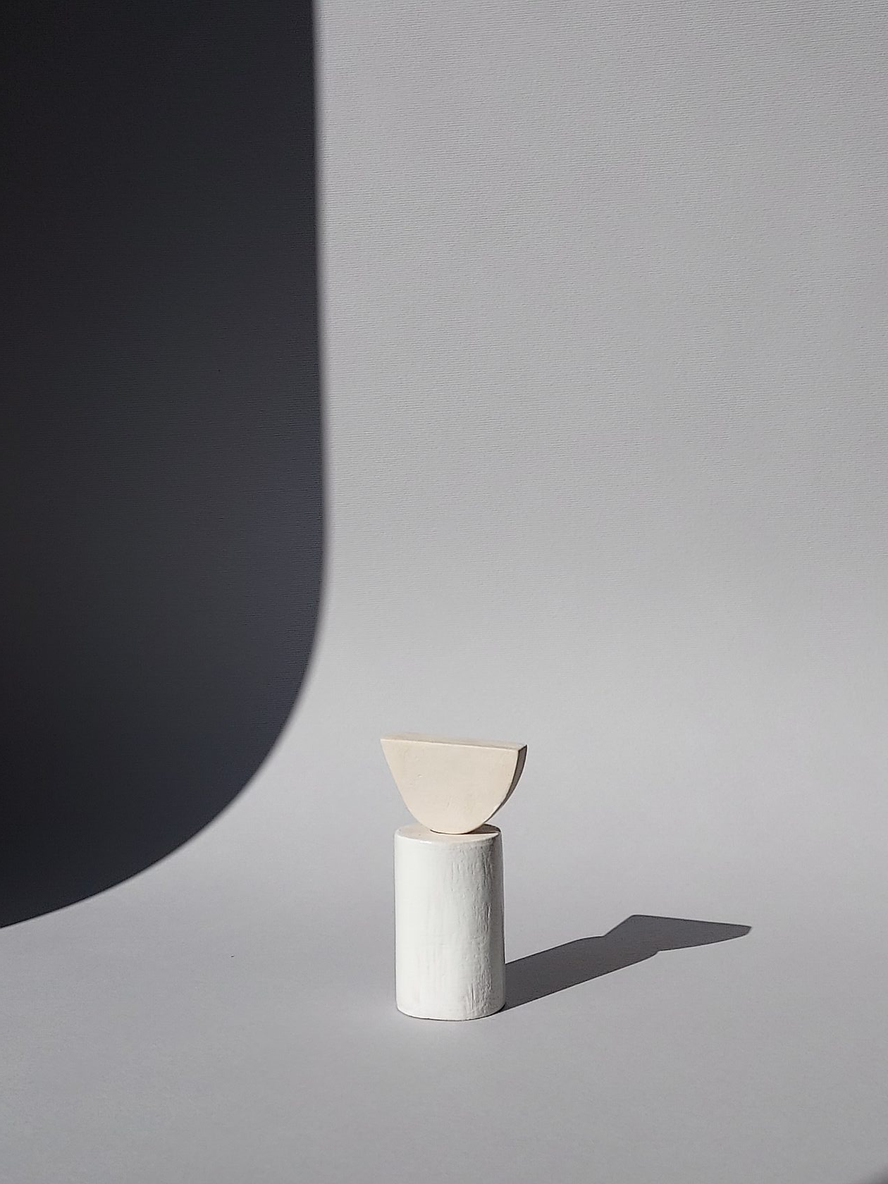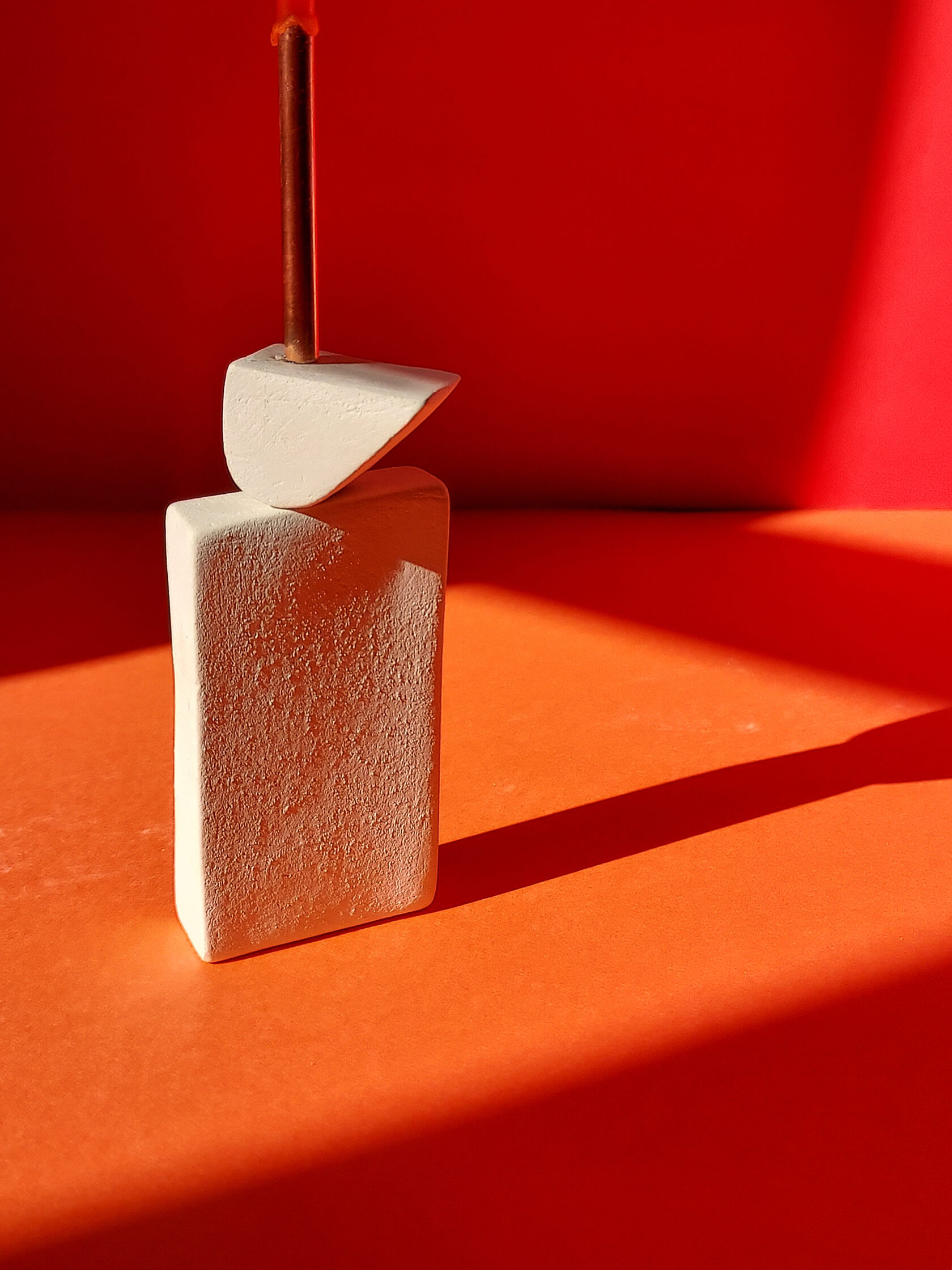 The sculpture is made of two shapes, balancing one on another, and completed with a brass tube for a candle or a dried flower.