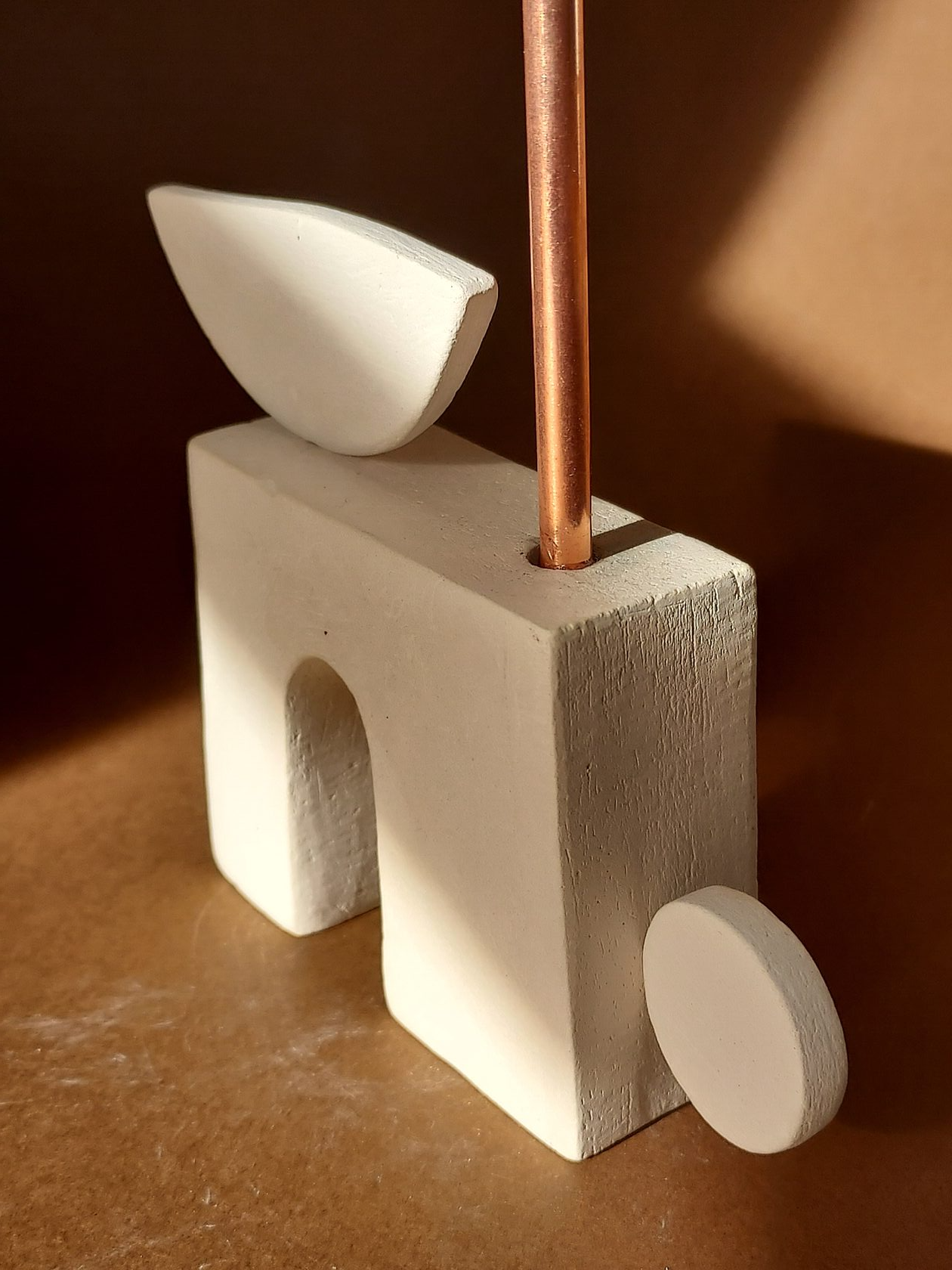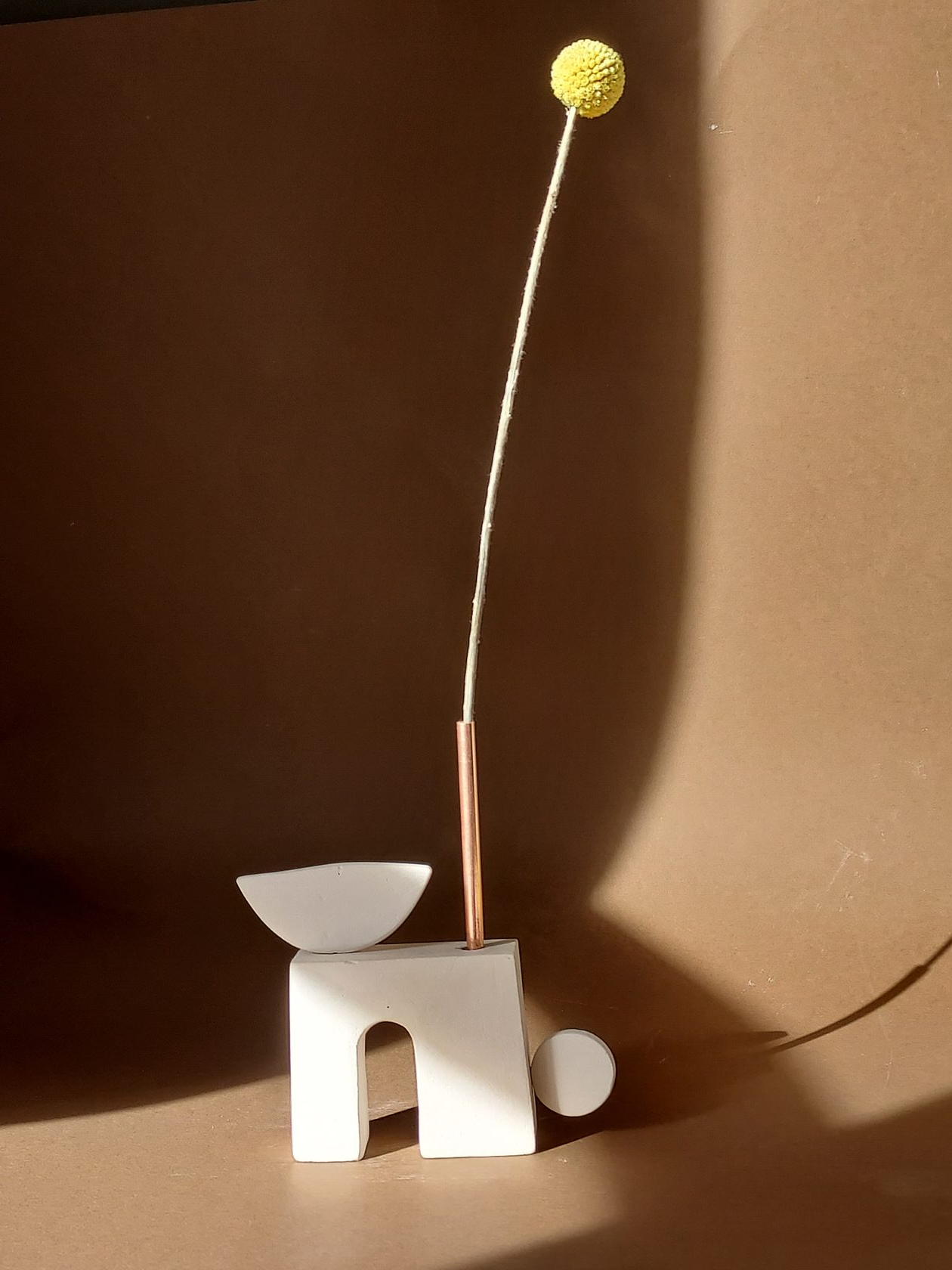 The block with an arch is completed with circle and semicircle; the brass tube can hold a dried flower or a candle.