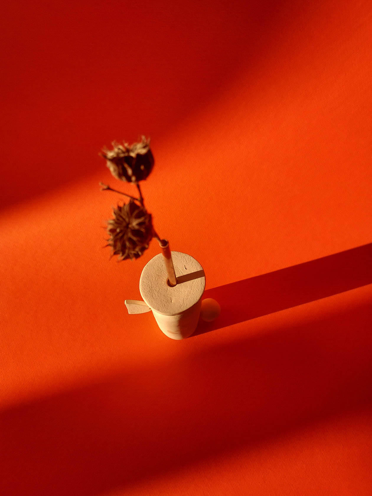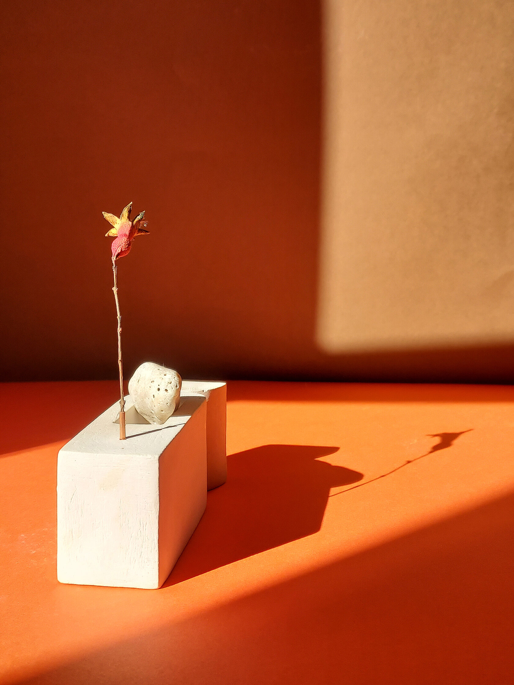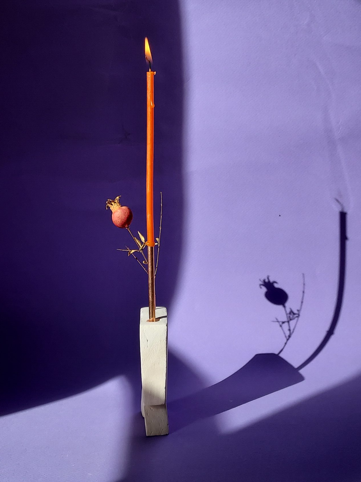 The sculpture has a hole for a candle and is completed with a brass slice and a thin brass stick for a twig.
