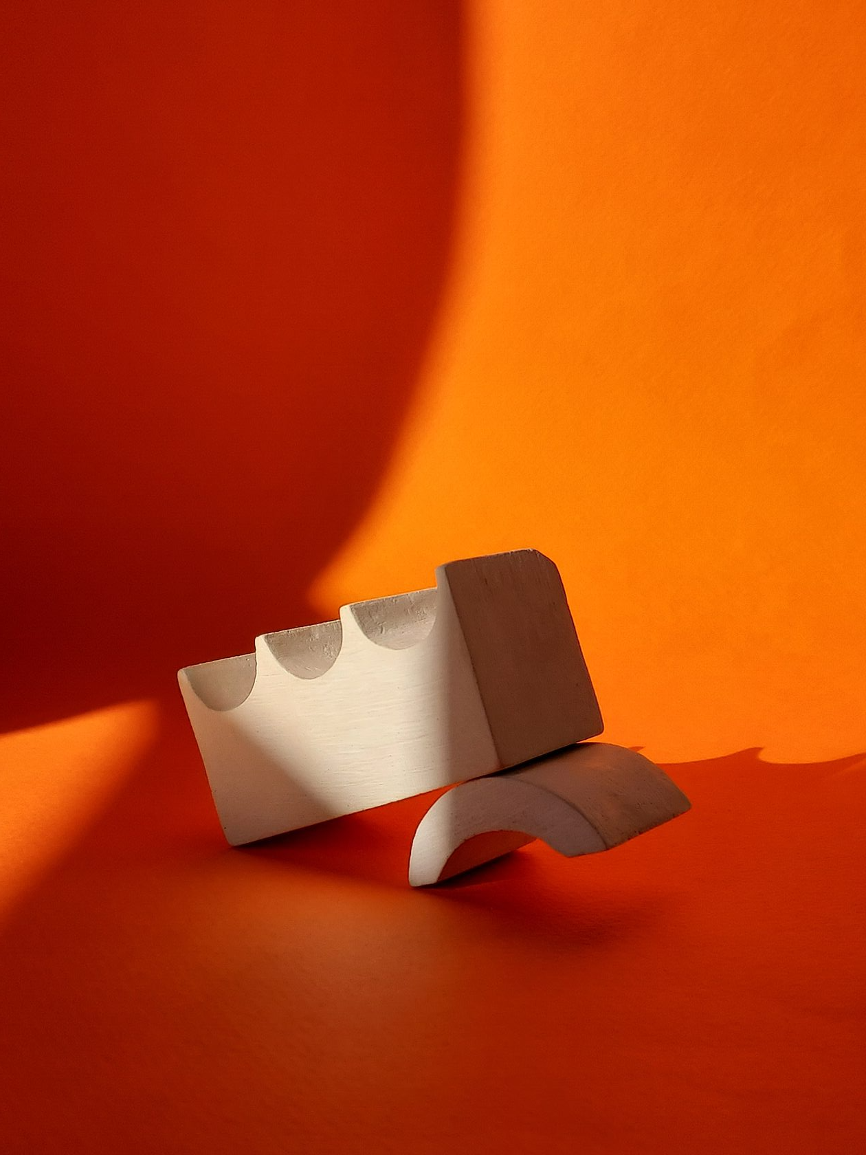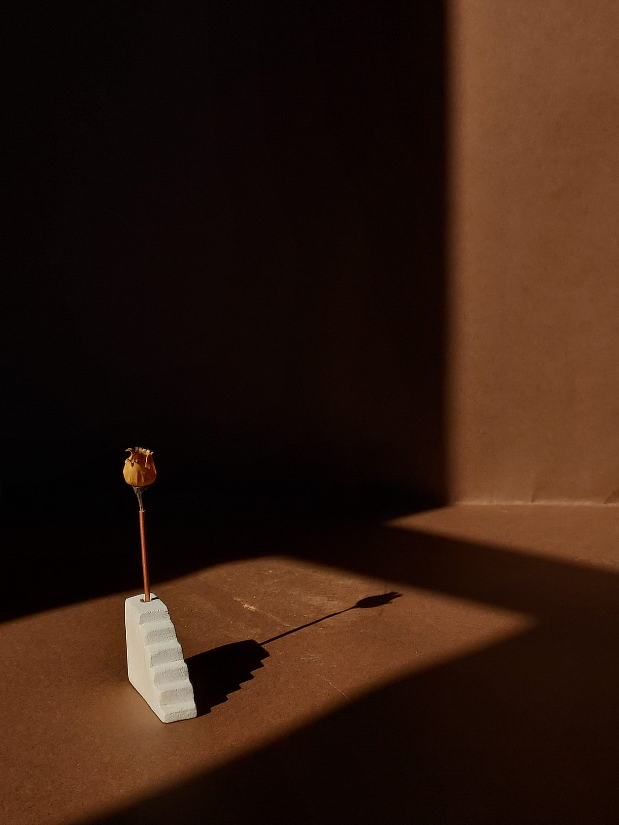Two large blocks, kept together by a small ball, are the base for a slender brass tube with a twig.