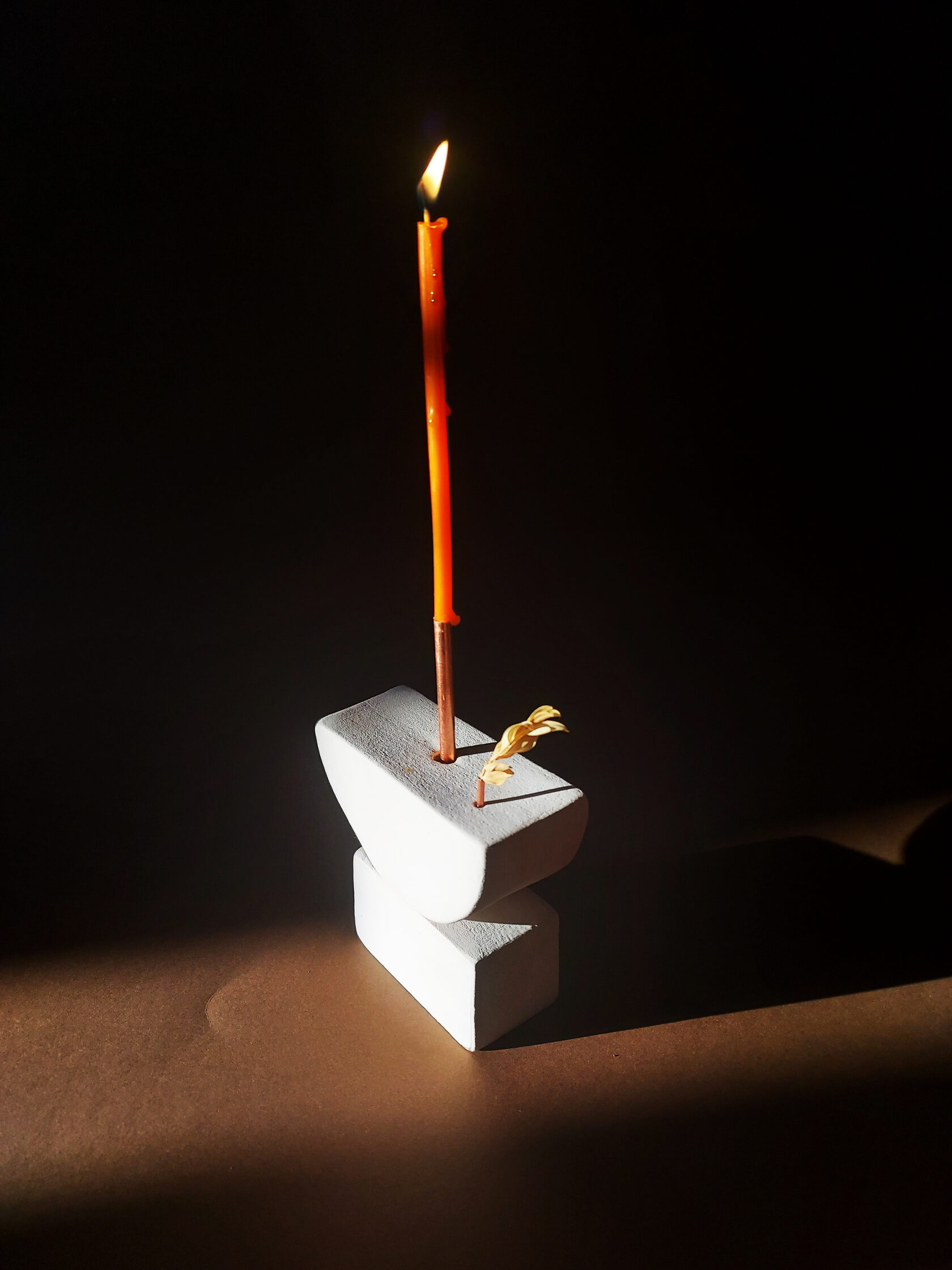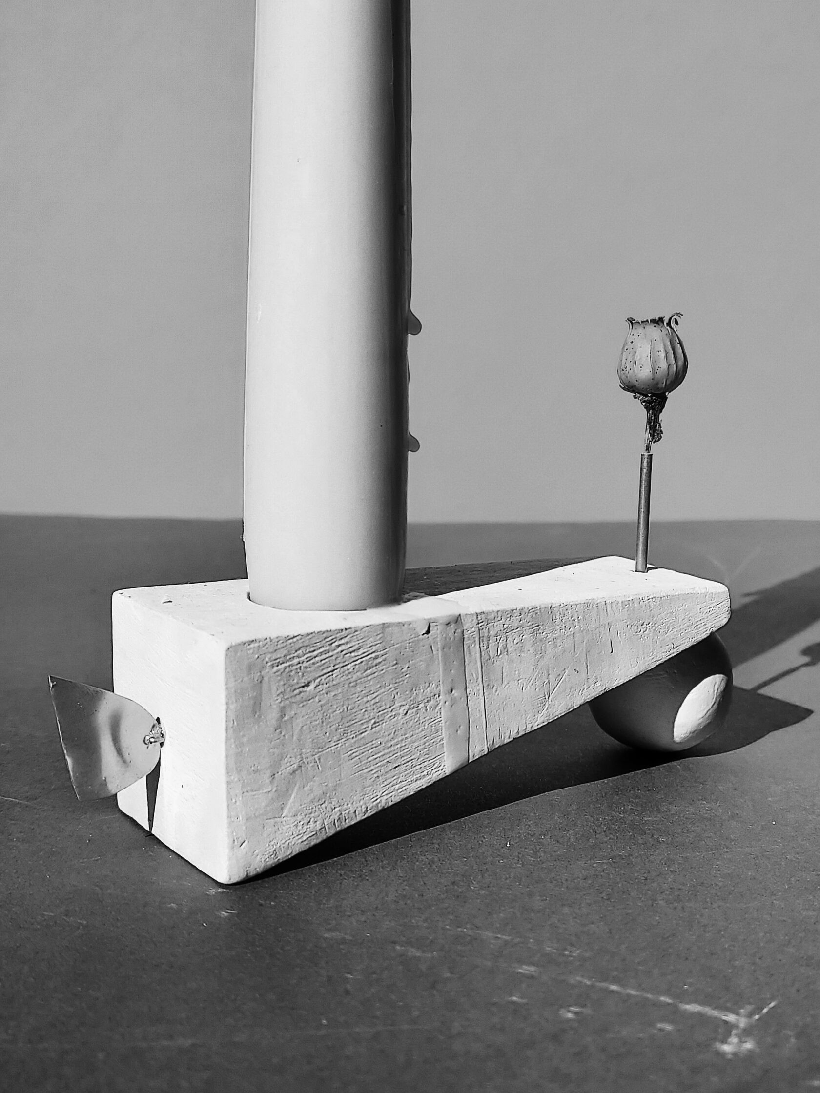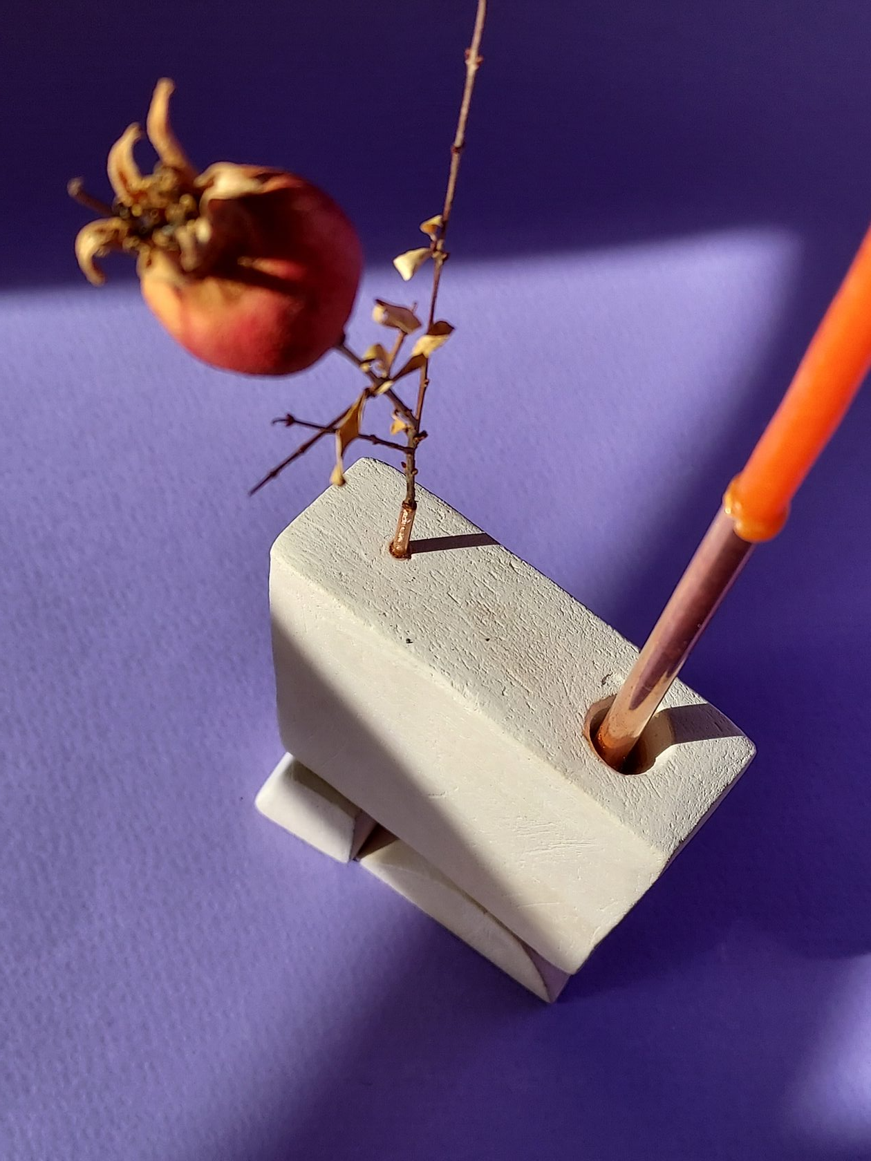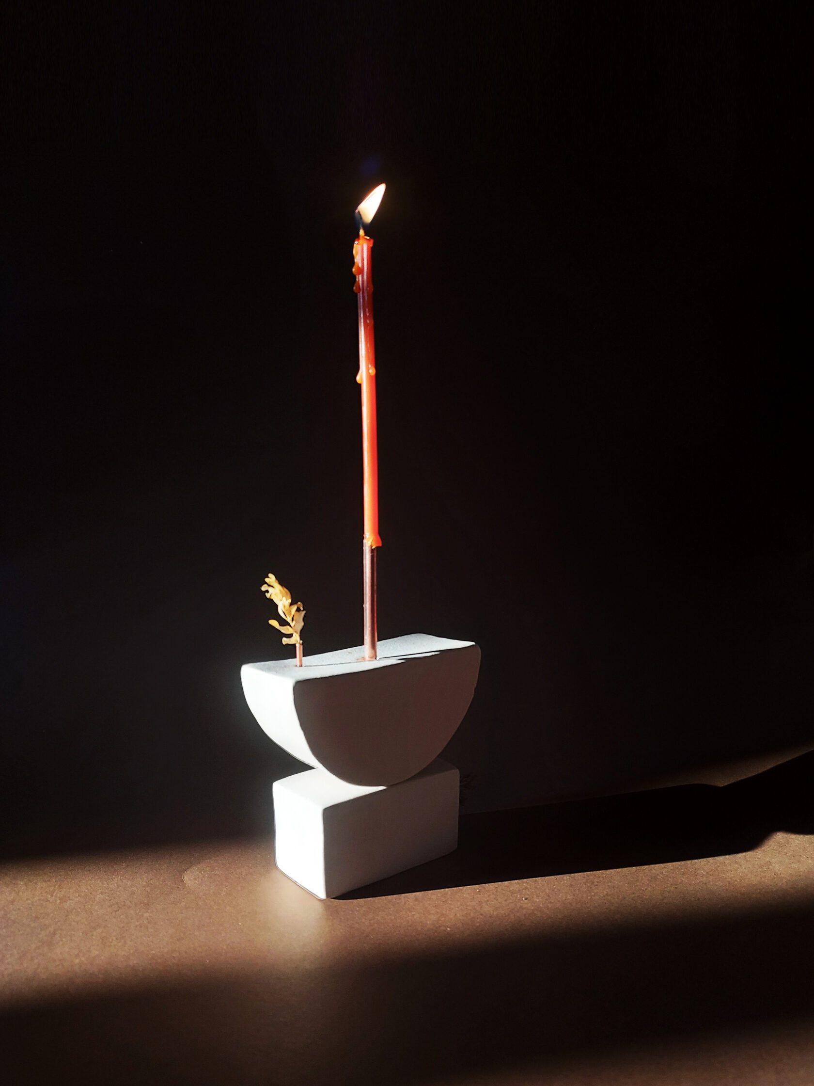 The solid block is balancing on smaller forms. Two brass tubes hold a thin candle and a twig.
