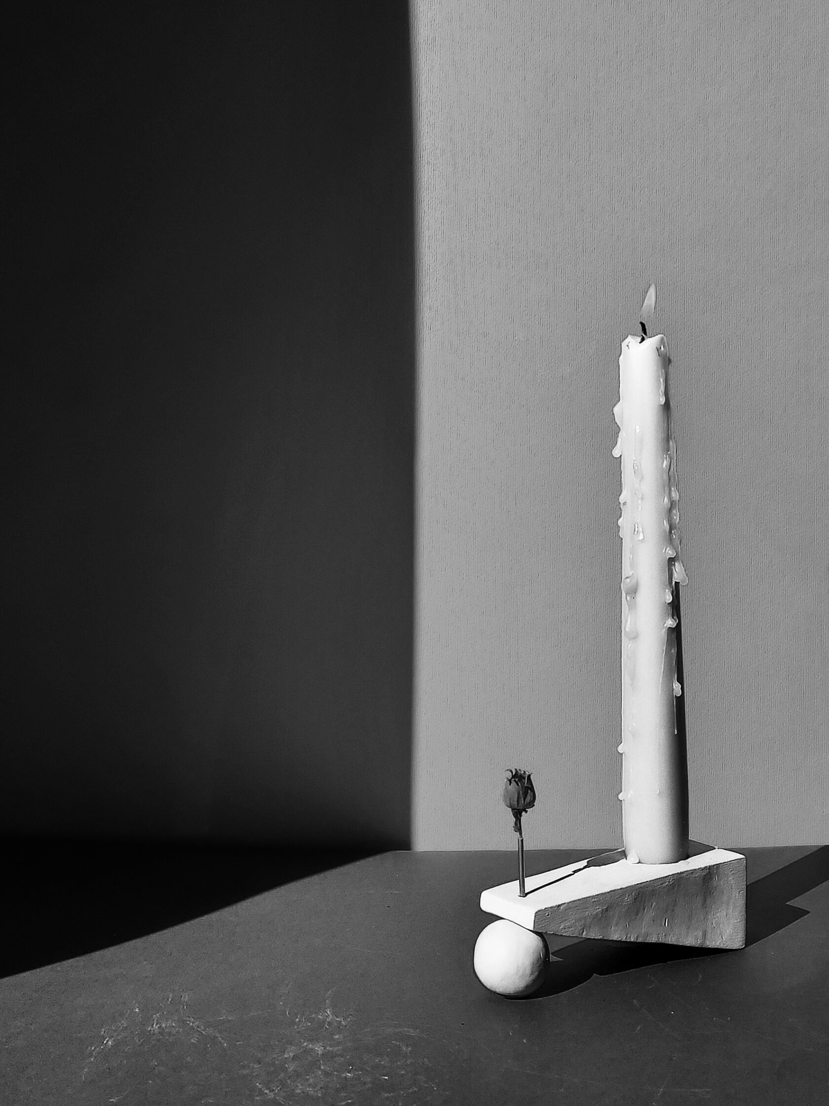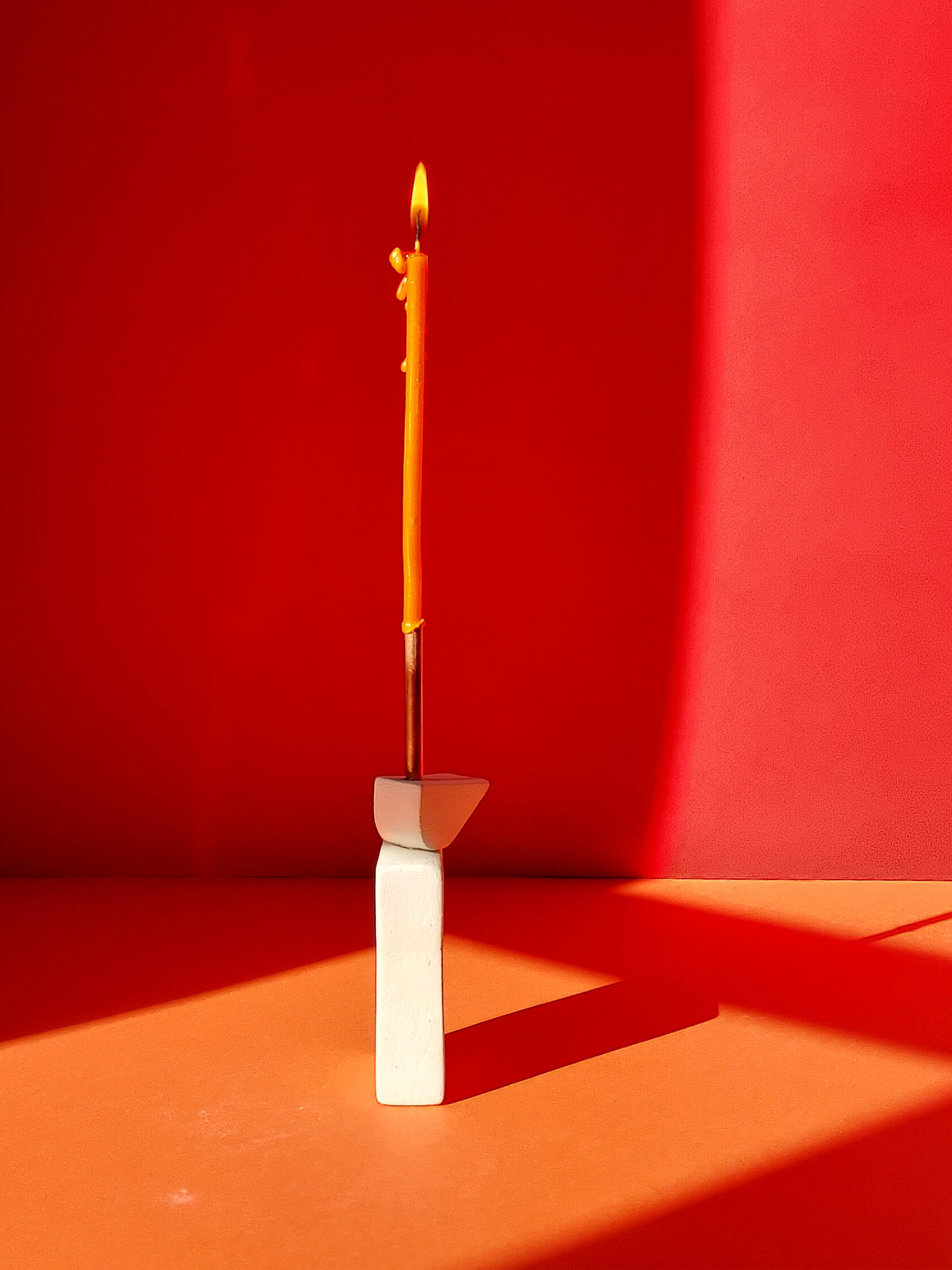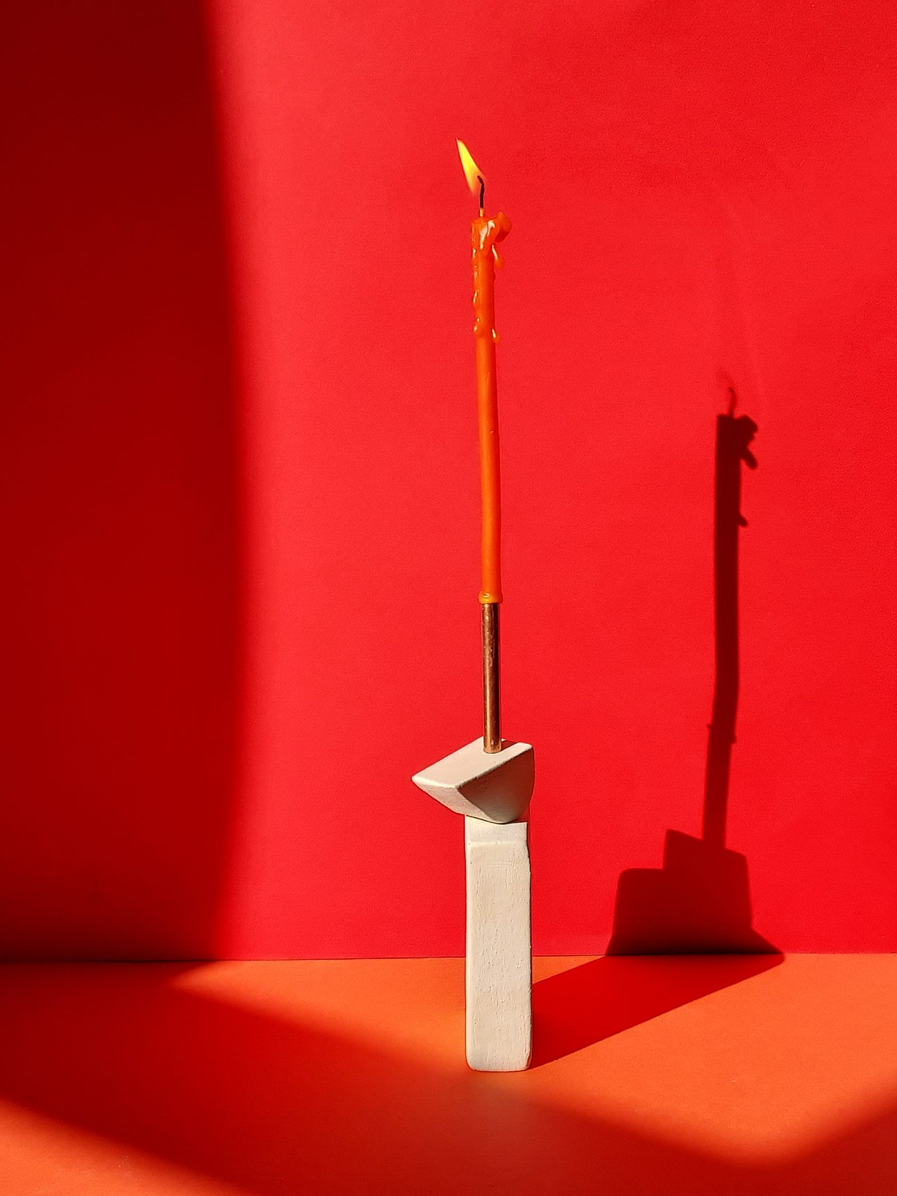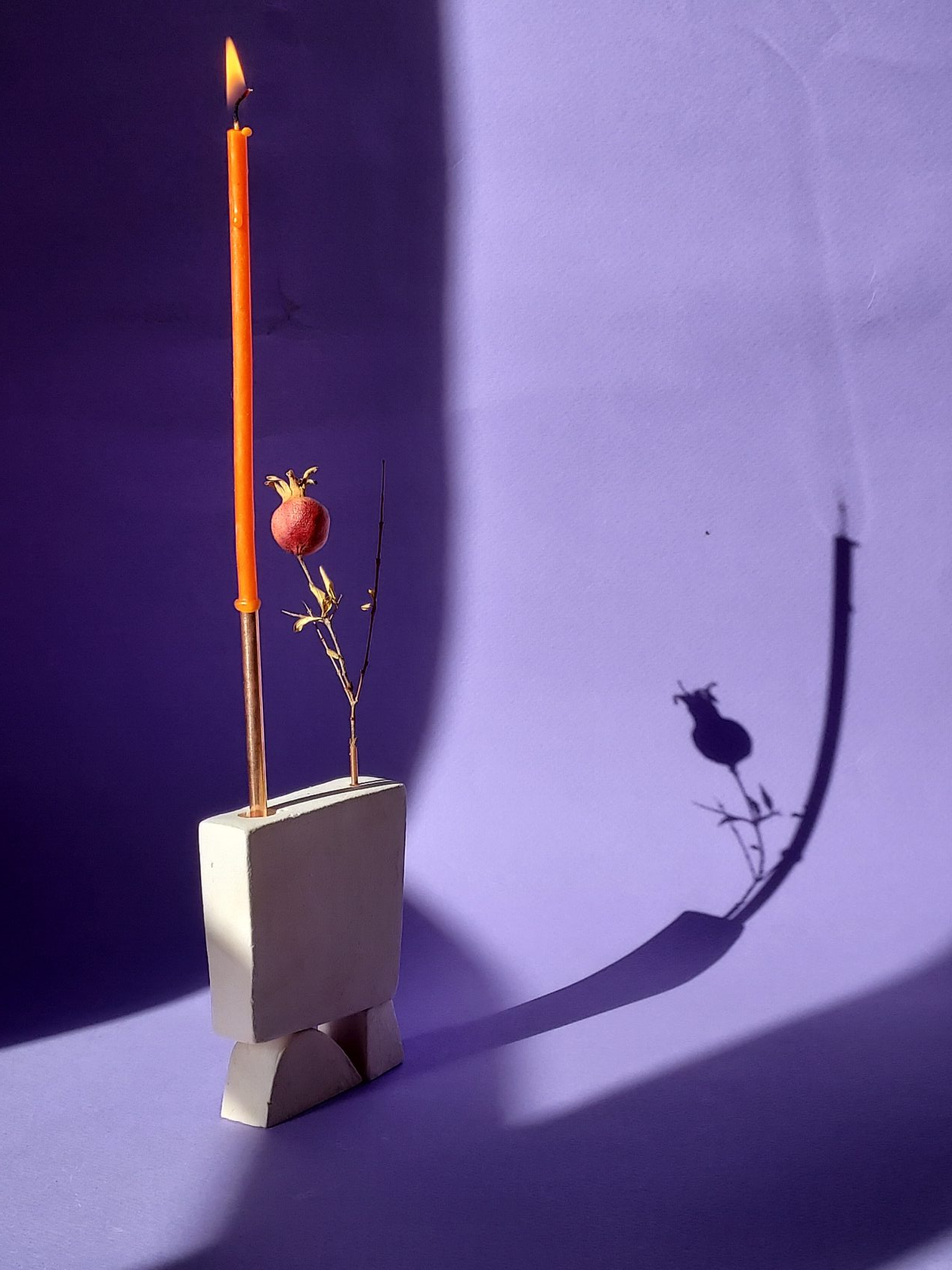 The solid block is balancing on smaller forms. Two brass tubes hold a thin candle and a twig.